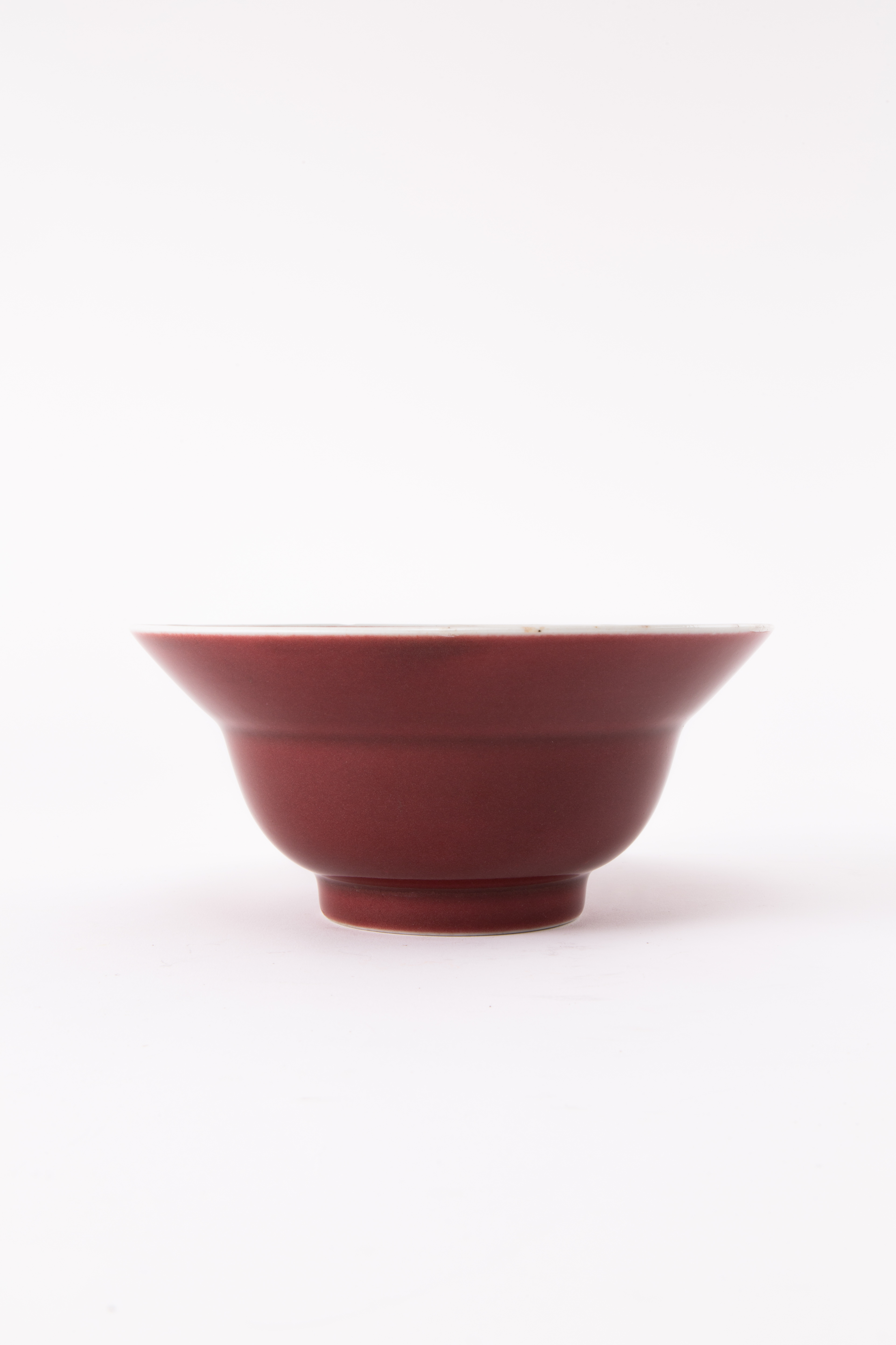 Rising in two rounded tiers from a short foot to an everted rim, covered with a variegated deep red glaze thinning to white at the rim and foot, 20.6cm.