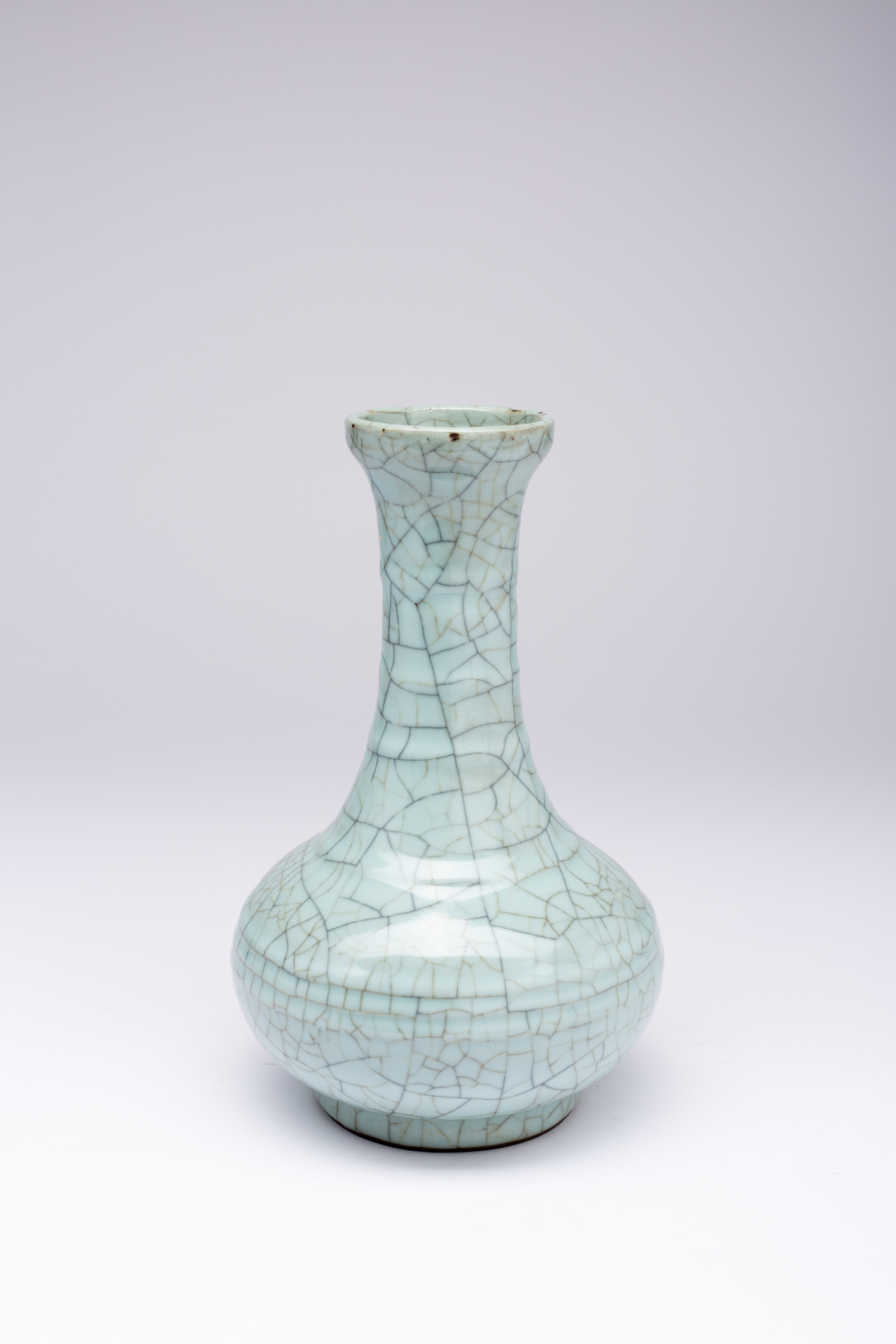 The tall waisted neck moulded with three ribs, the compressed circular body with further bands all beneath a crackle glaze, 25.5cm.