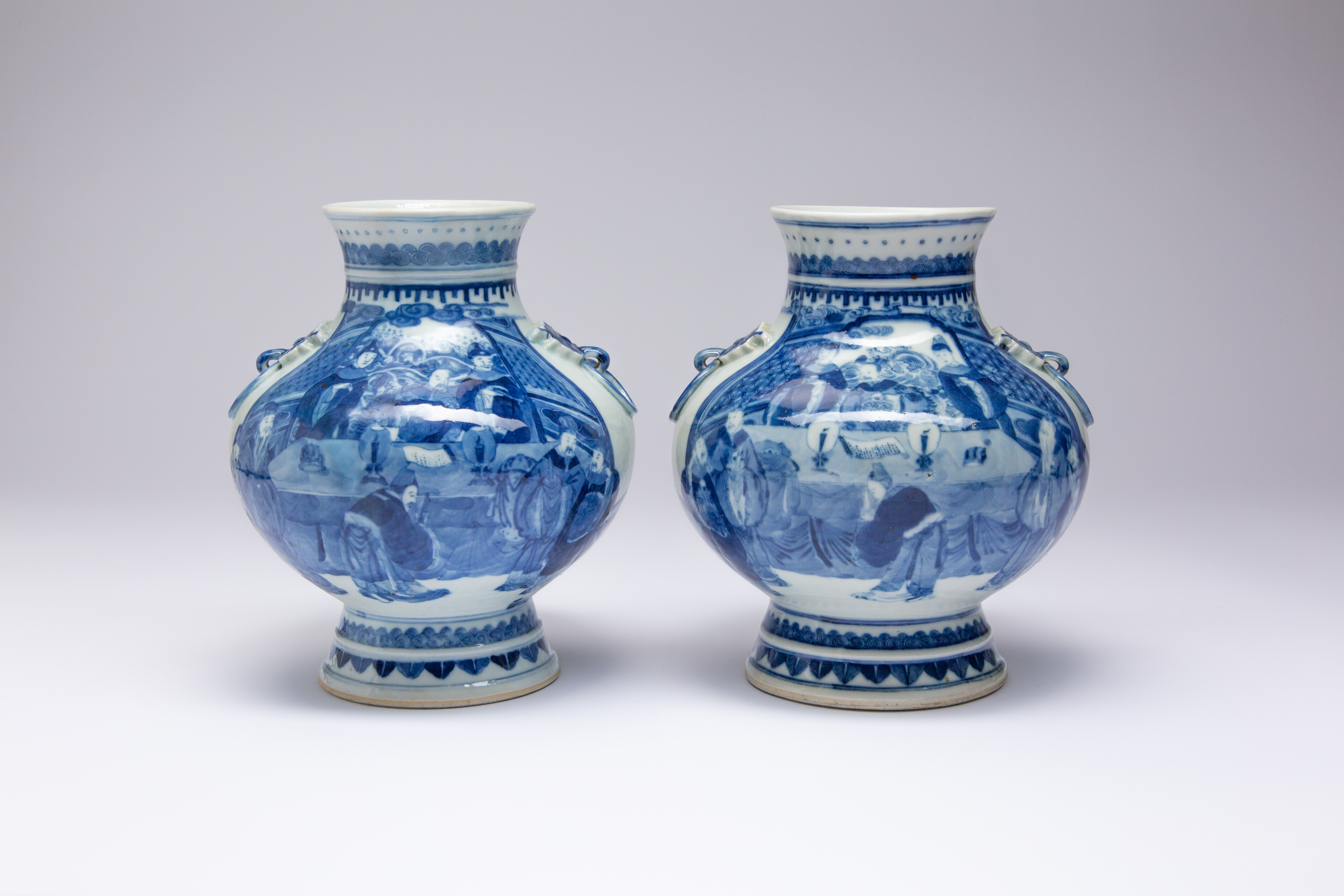Each painted with two scenes depicting the Emperor, dignitaries, ladies and attendants in a court scene, between archaistic decorative borders and a pair of mythical beast mask handles with rings, the bases with Kangxi marks, 23.5cm. (2)