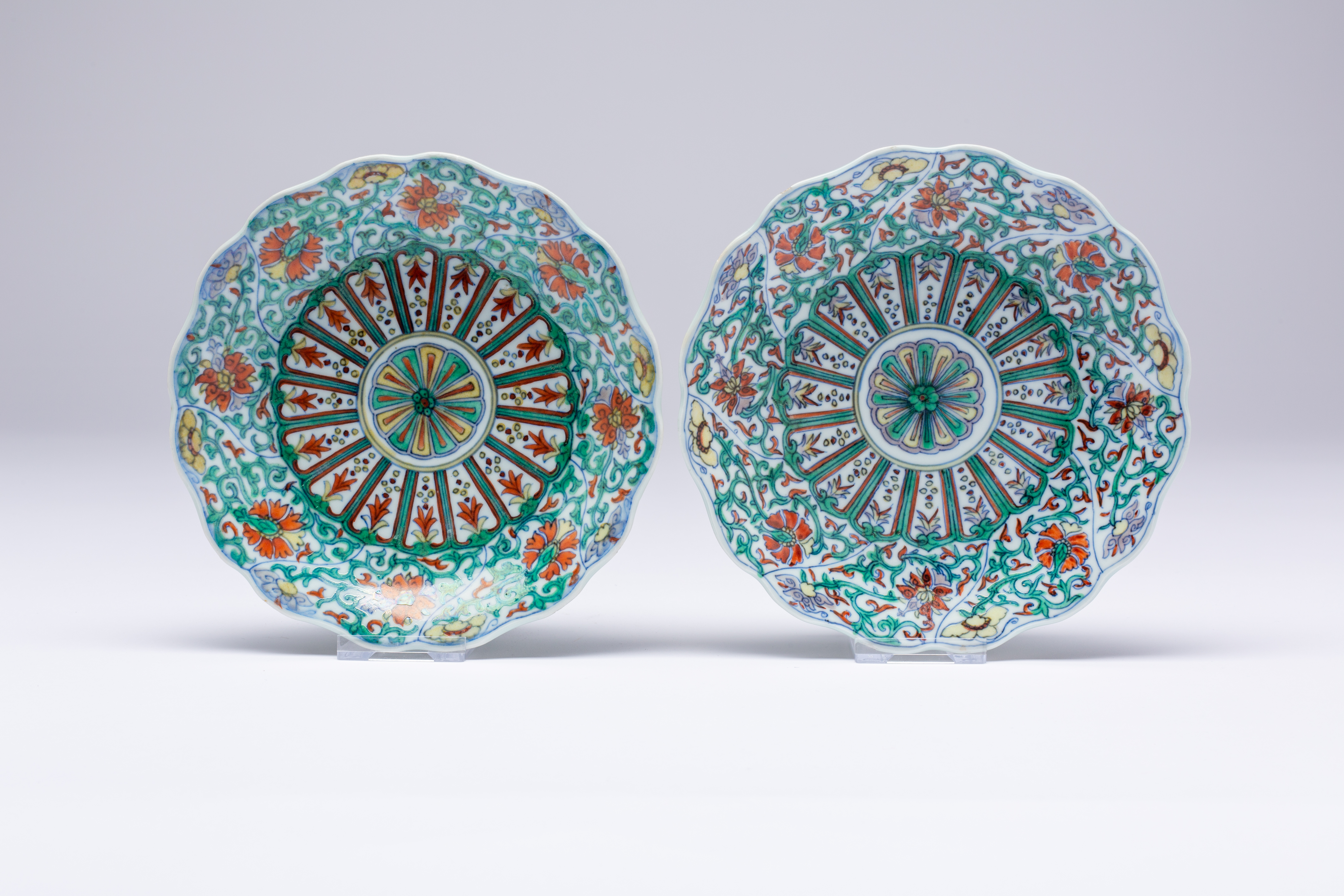 Each painted with a stylised central flowerhead encircled by radiating petal-shaped lappets, containing scrolling floral and foliate designs, the underside decorated with sprays of the sanduo, each with a Qianlong mark, 15.8cm. (2)