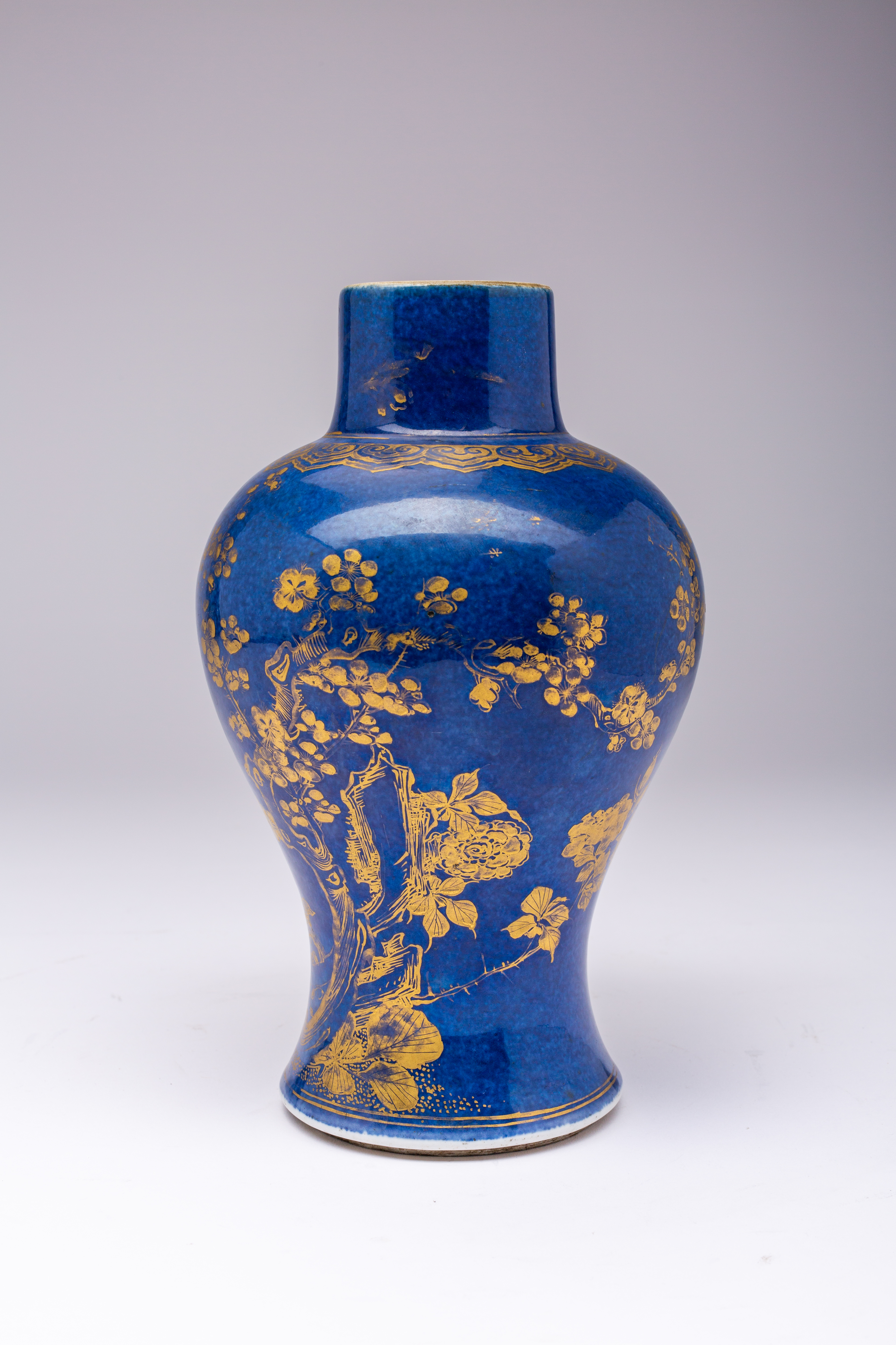 A CHINESE BLUE-GROUND AND GILT DECORATED BALUSTER VASE