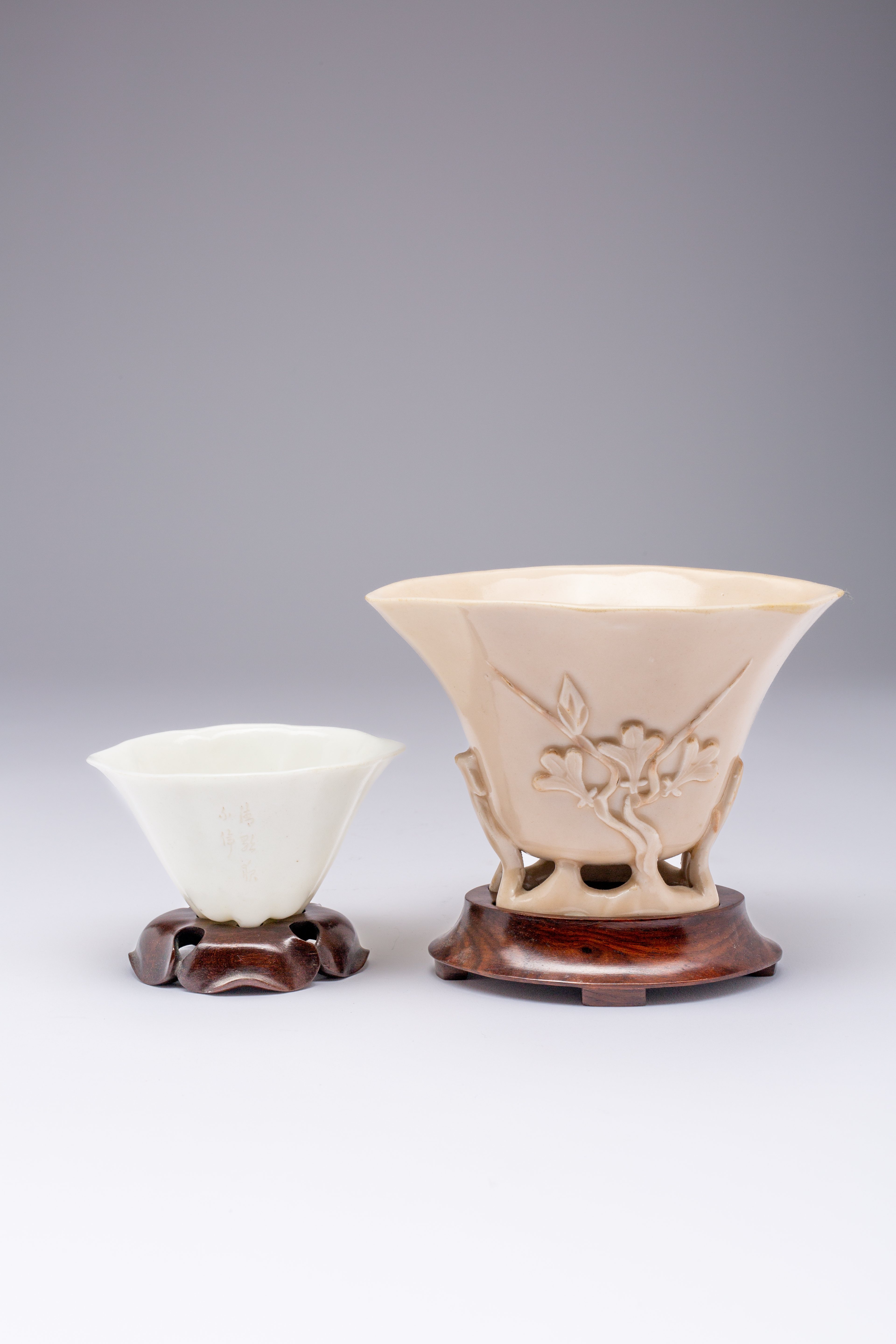 The larger moulded with prunus and a leafy sprig, the smaller with a poetic inscription, both with wood stands, 13.5cm. (4)