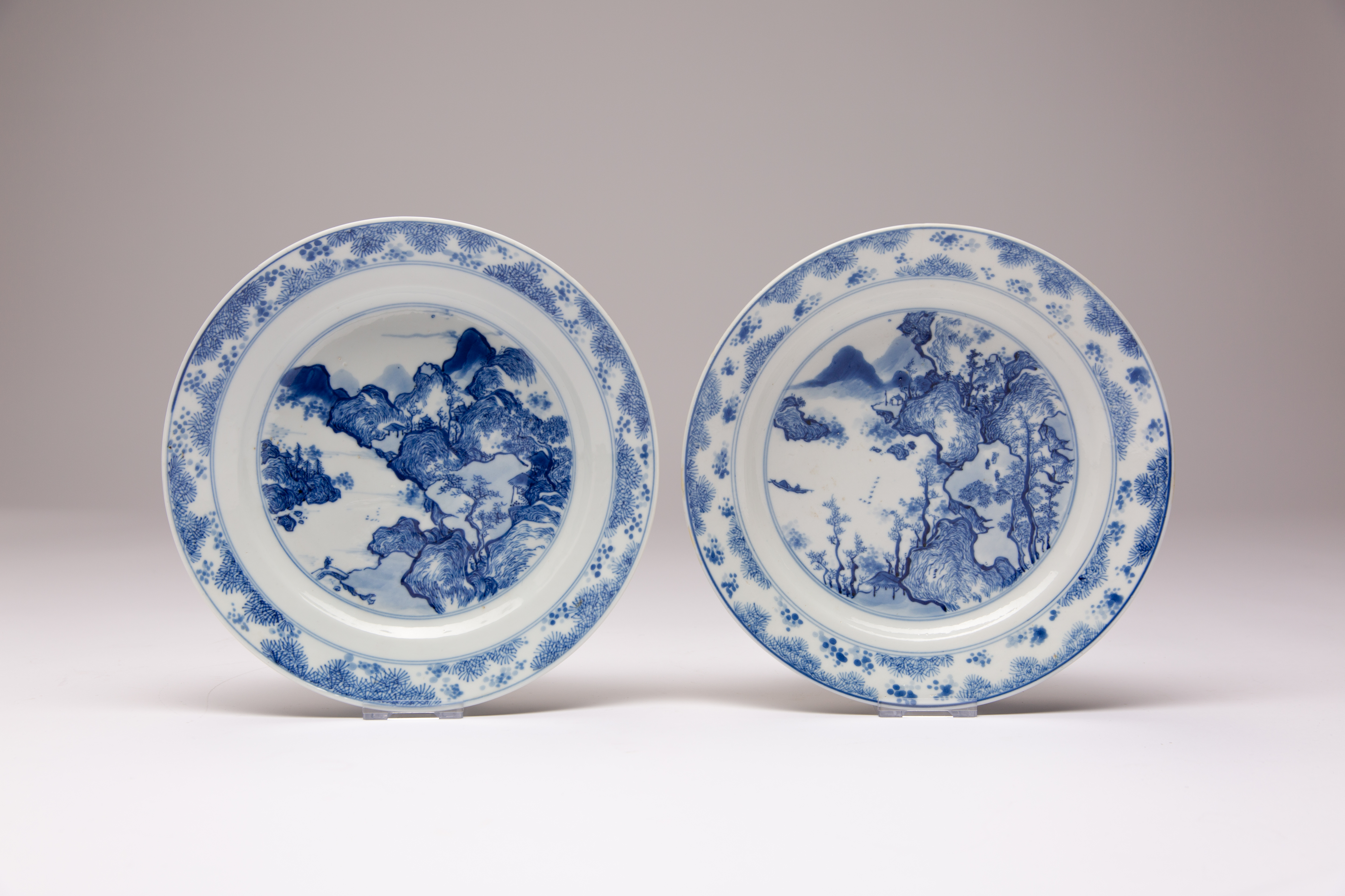 A PAIR OF CHINESE BLUE AND WHITE 'MASTER OF THE ROCKS' DISHES