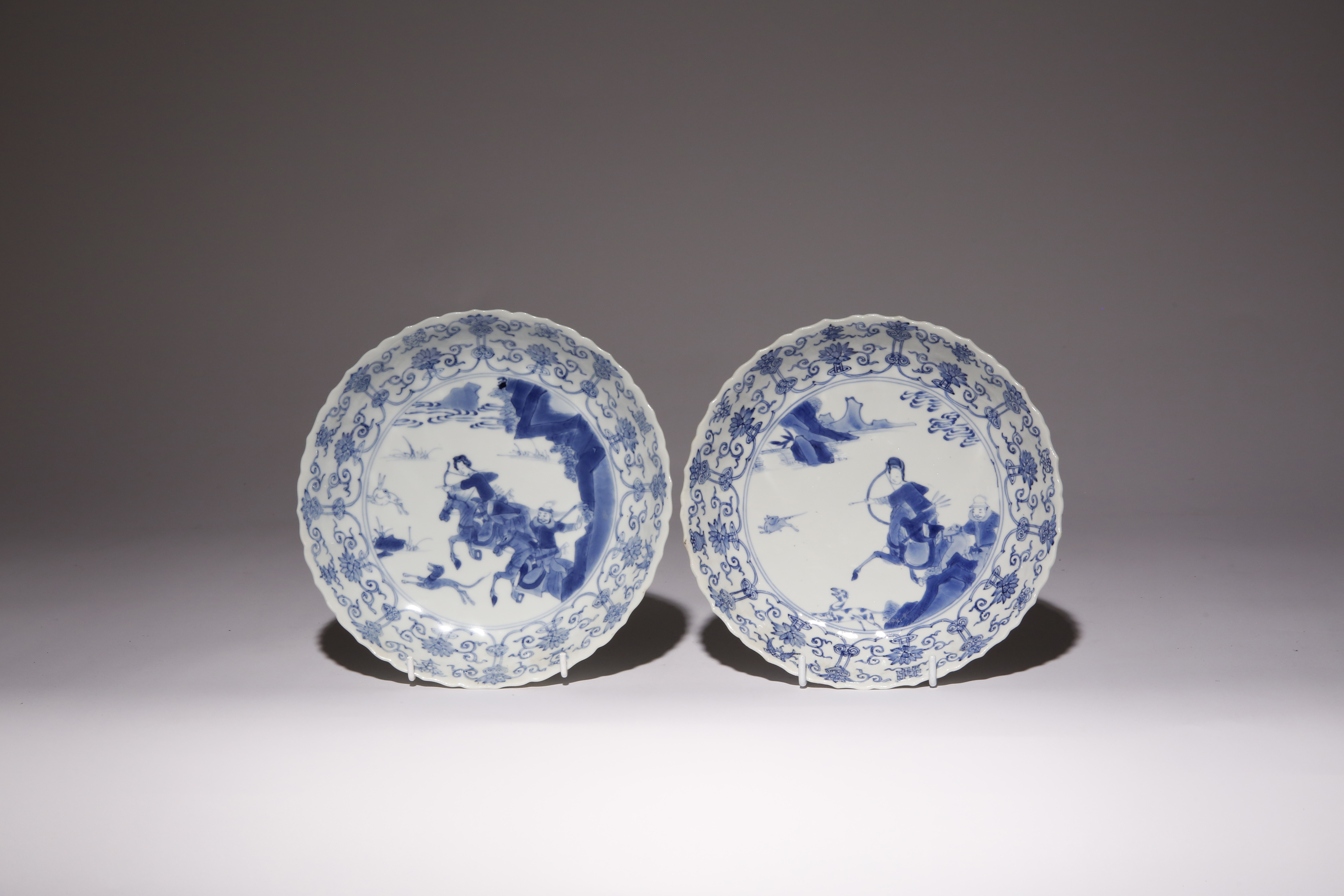 A PAIR OF CHINESE BLUE AND WHITE MOULDED 'HUNTING' DISHES