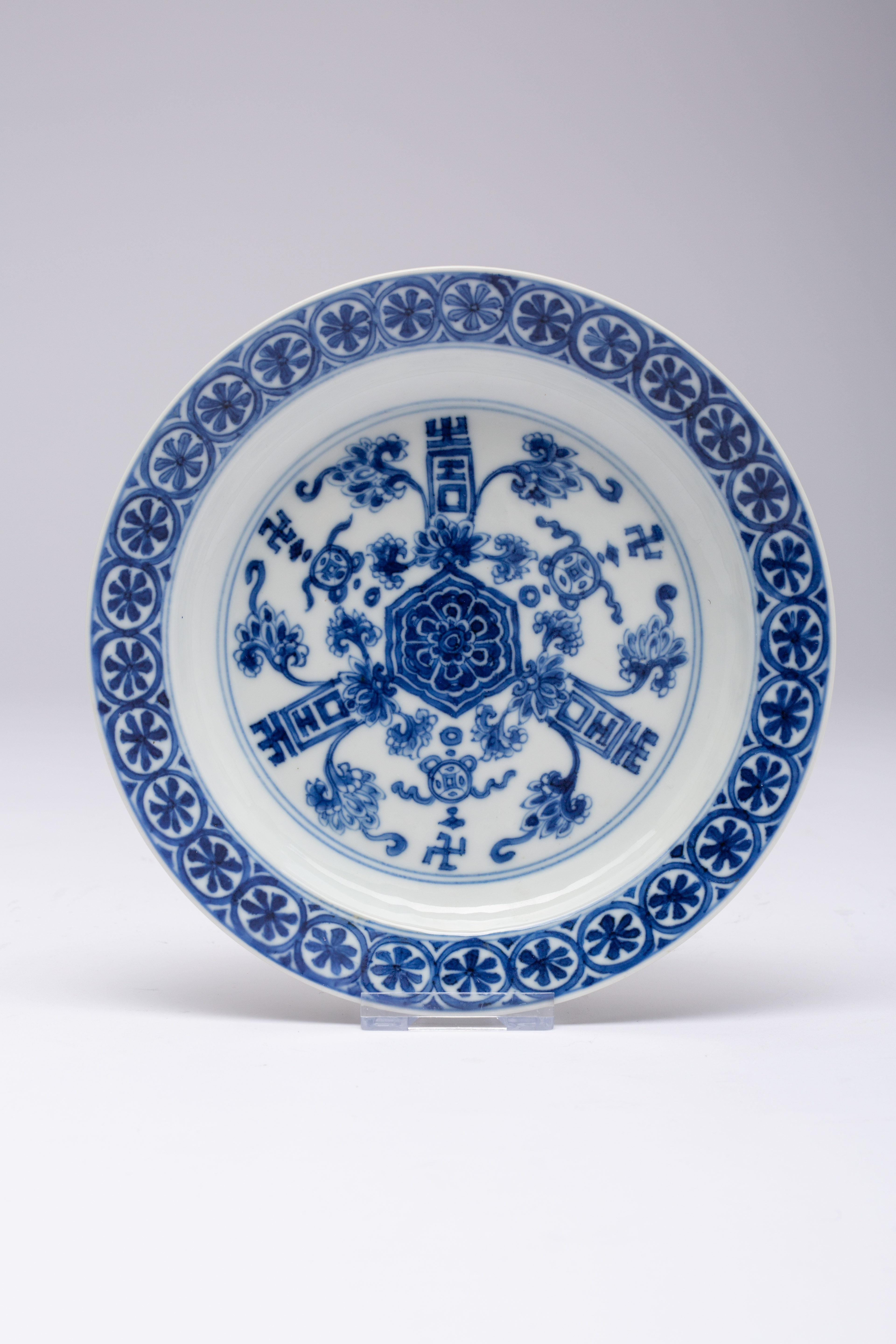 Decorated with three shou characters divided by flowers, ribbon tied cash and swastikas, the border with flowerheads, the base with a Chenghua mark, 15.8cm.