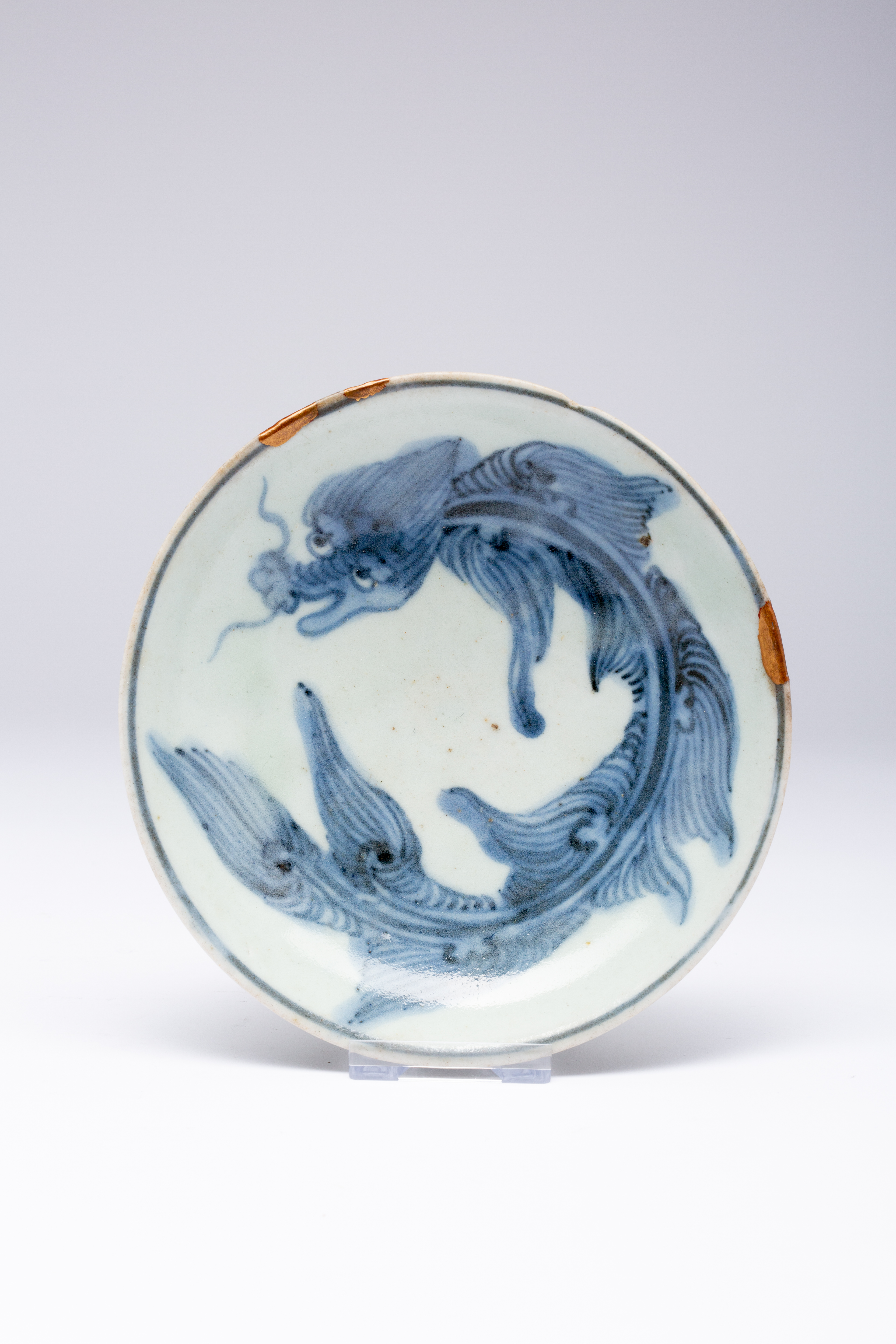 Decorated in underglaze blue with a highly stylised fish-dragon, the mythical beast depicted with multiple fins and a long curved body, the rim with three reddish kintsugi lacquer repairs; raised on a small unglazed foot, 14.2cm.