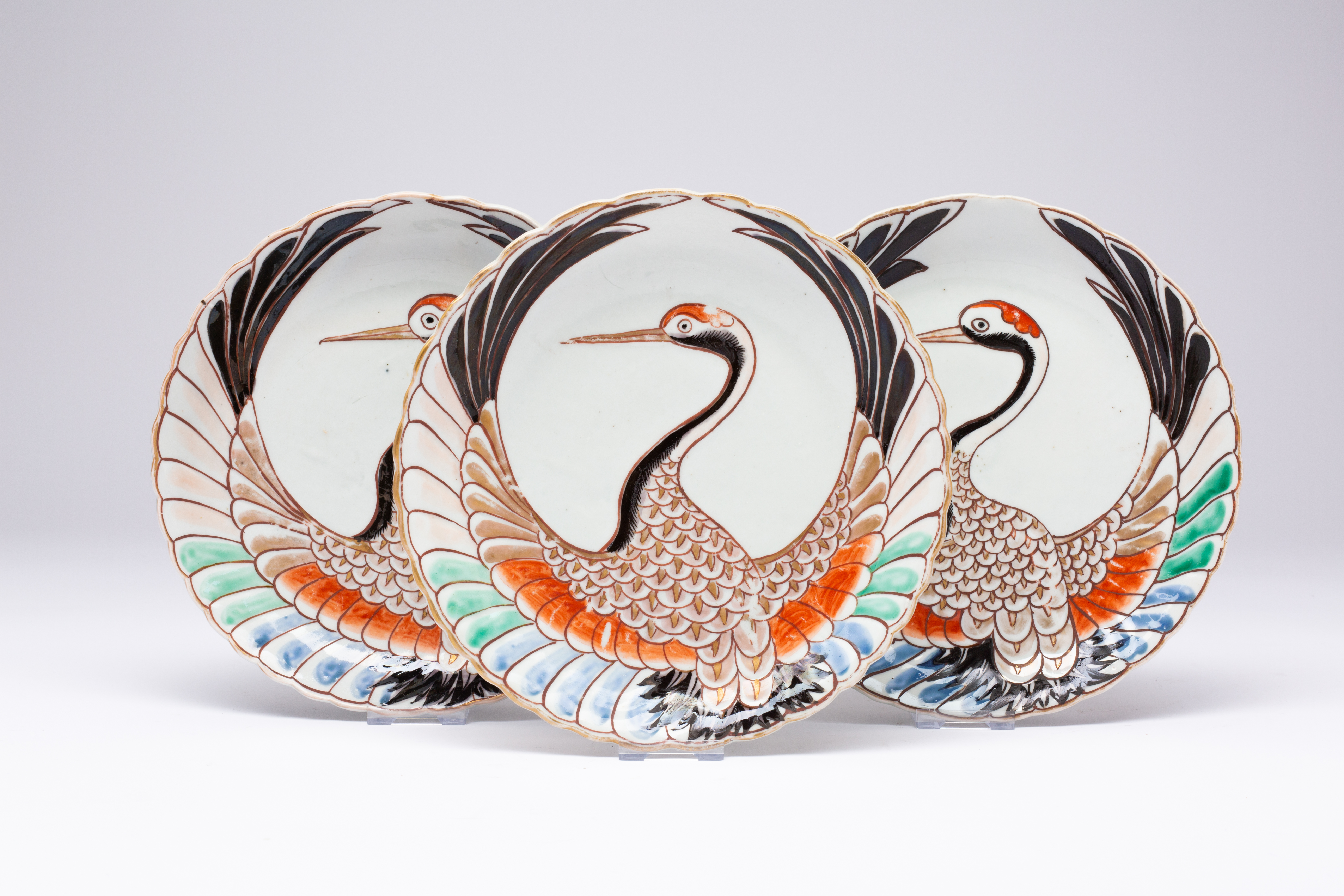 With scalloped rims, each formed as a crane with its wings outstretched above its head, painted in polychrome enamels and gilt, the undersides left undecorated, each 22cm. (3)