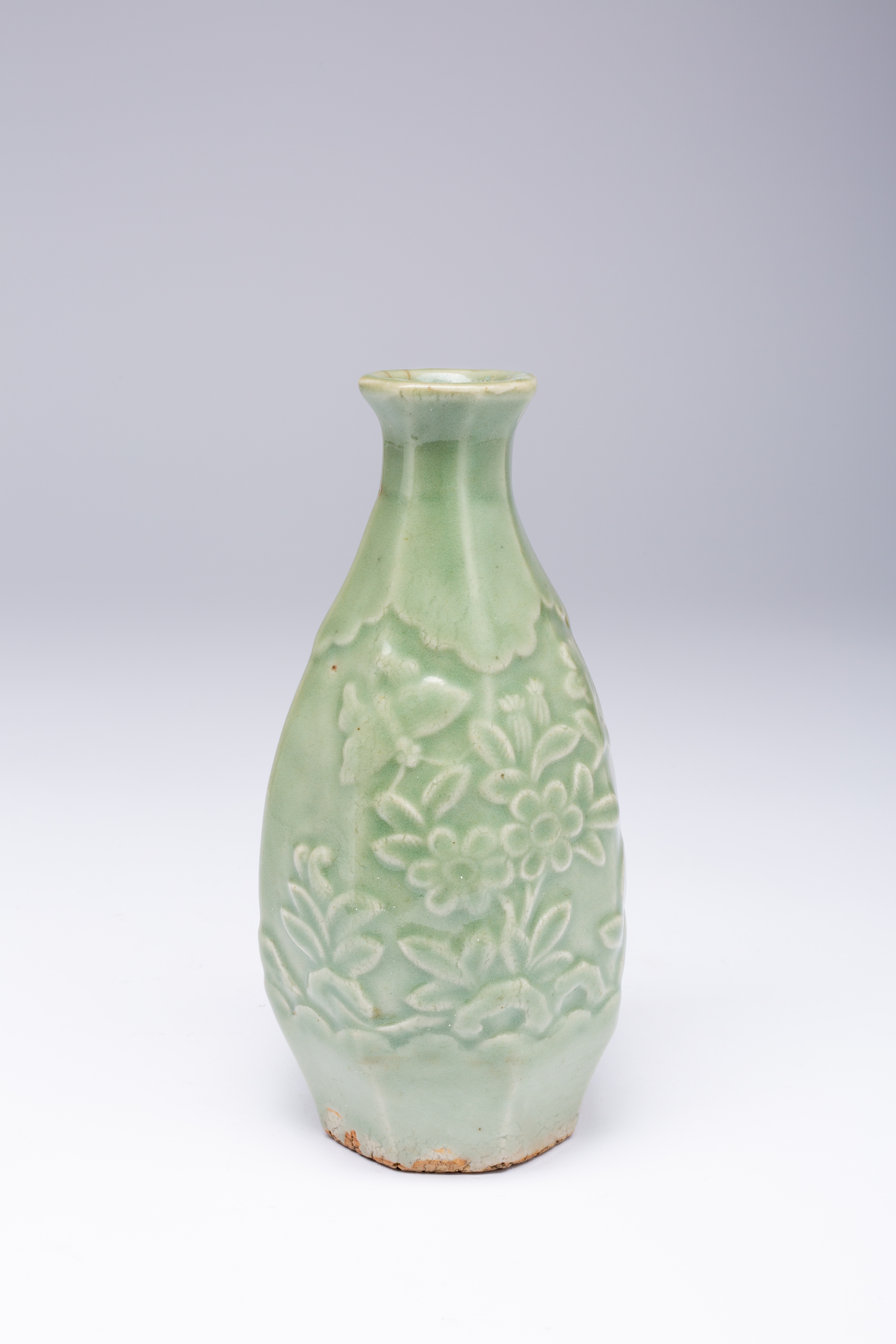 A JAPANESE CELADON MOULDED TOKKURI (SAKE BOTTLE)