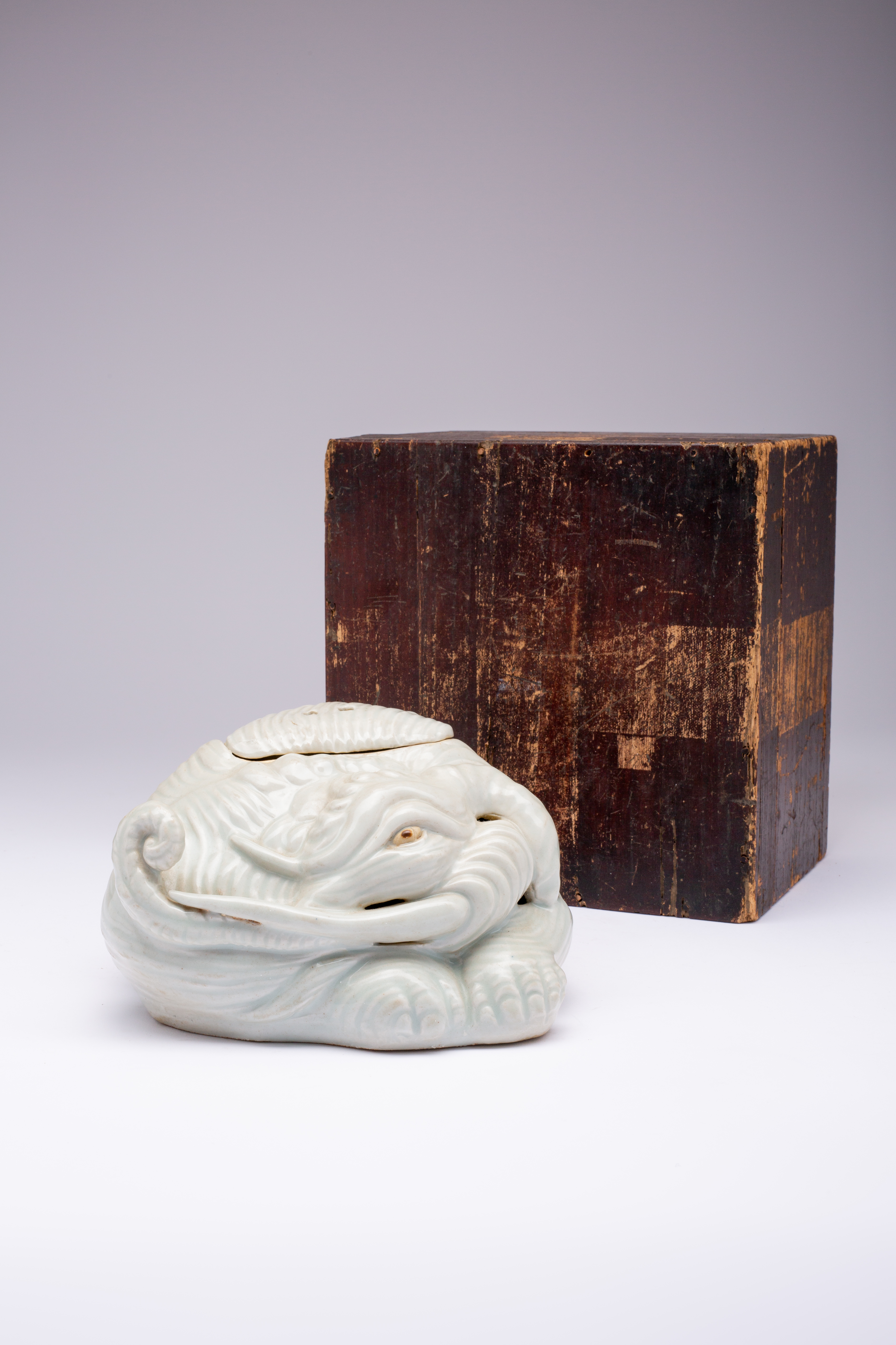 The recumbent pachyderm with its head slightly turned to the right, the surface with a bluish-white glaze and the eye with an iron-brown dot, the lid pierced with four circular apertures, the base with gauze marks, in a tomobako wood box, 18cm. (3)