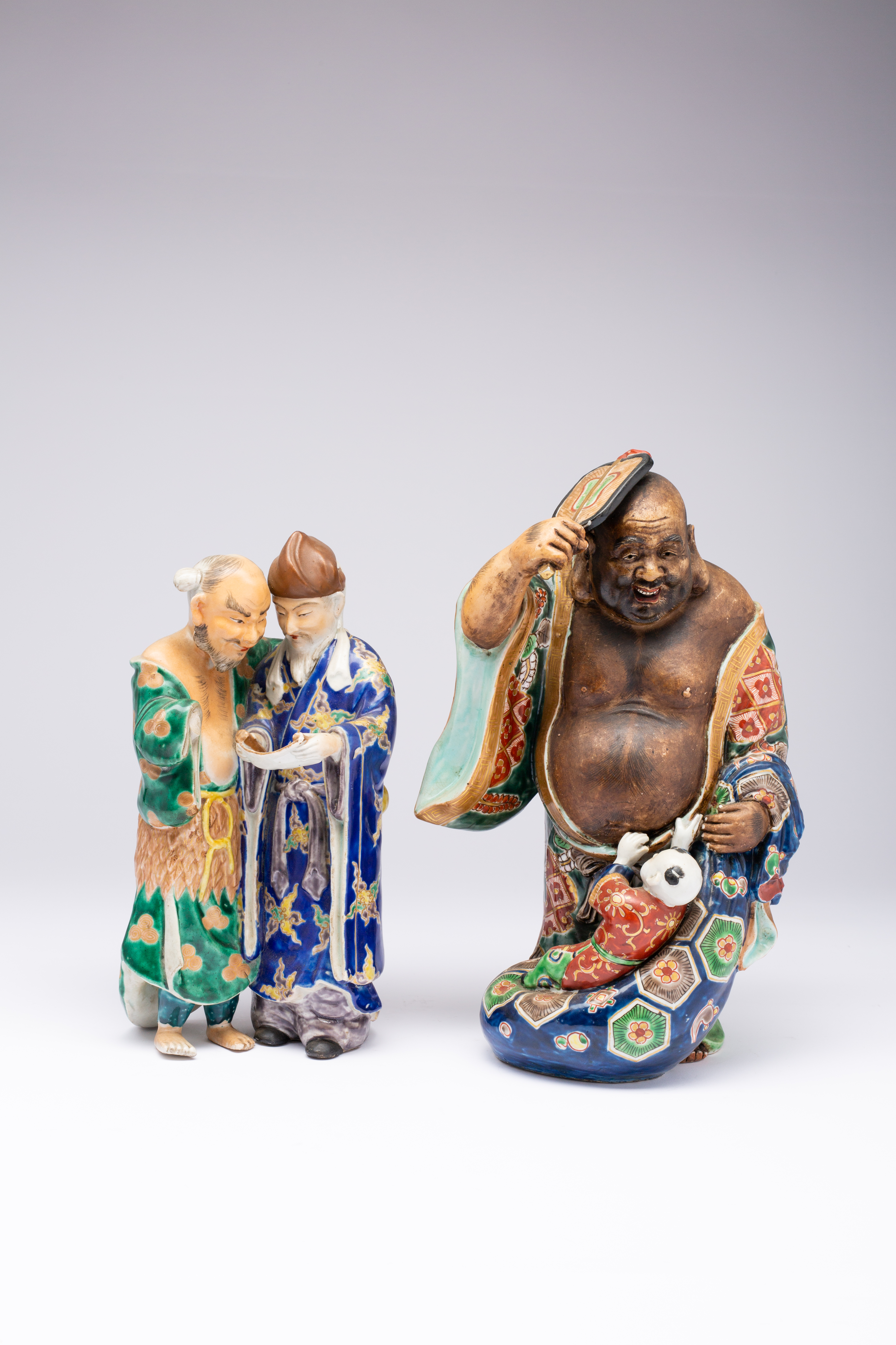 One of Kenzan and Jittoku, the two friends examining a handscroll; the other depicting Hotei with a small boy; both groups colourfully painted and with details in gilt, 28cm and 32.5cm respectively. (2)