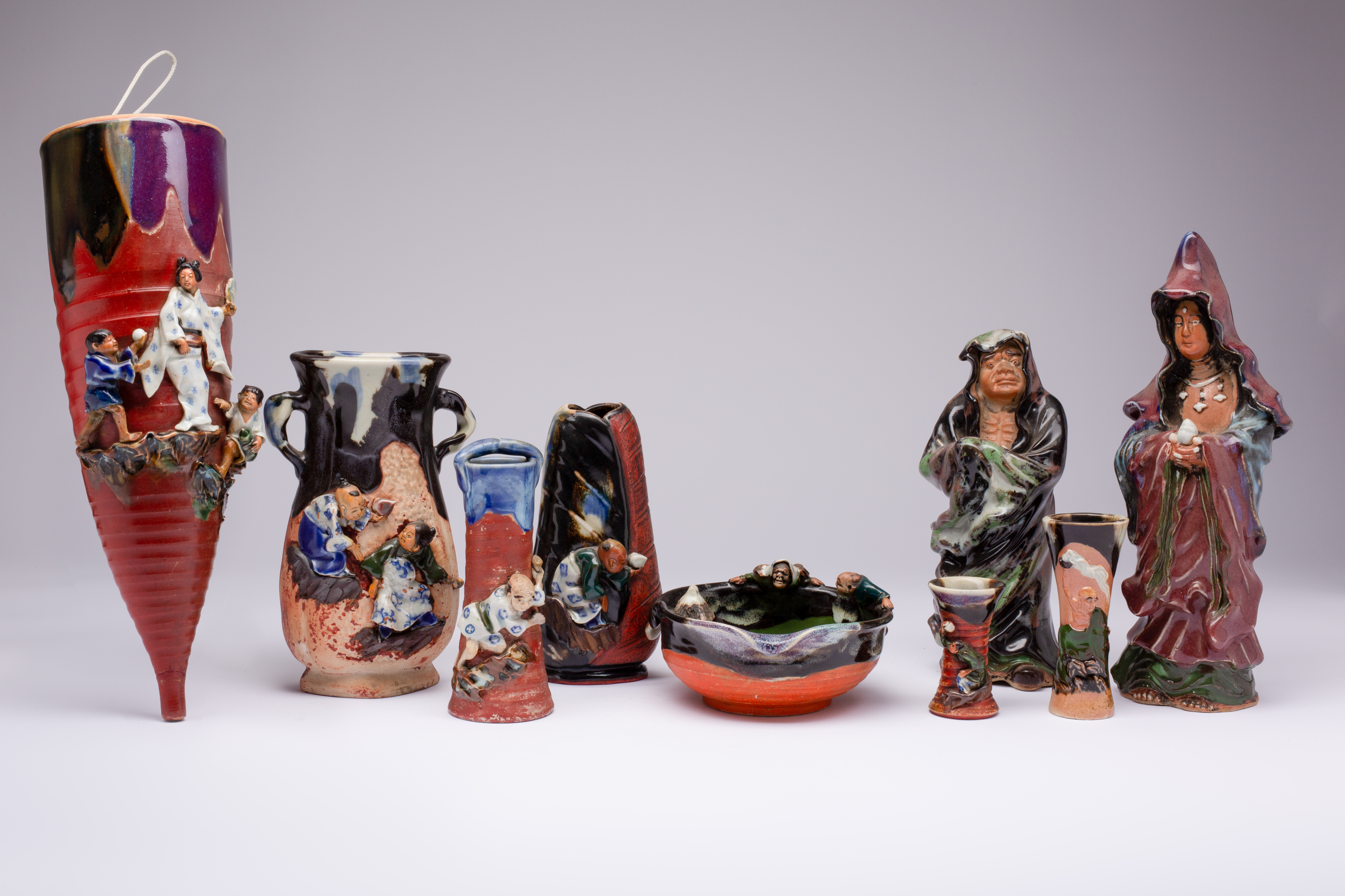 Comprising: a figure of Kannon and another of Daruma; a large conical wall vase, a bowl, two tall cups and three vases of various sizes; all the vessels decorated with typical dripping glazes and figures in relief, five signed Banni and three with the mark for Inoue Ryosai, 34.5cm max. (9)