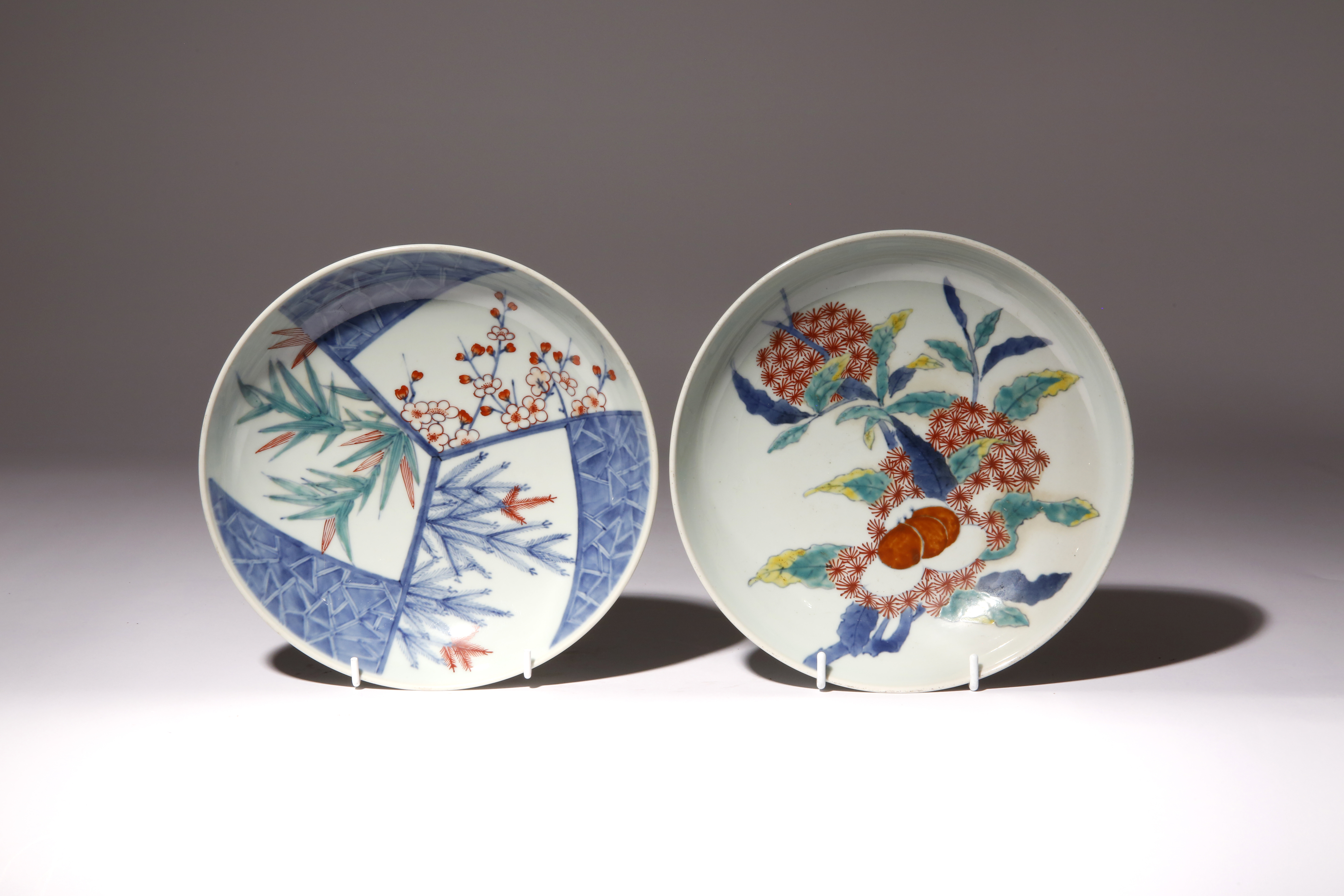 Both decorated in underglaze blue and polychrome enamels, one with shaped panels enclosing the shochikubai (pine, prunus and bamboo) on a cracked-ice ground, the other with a fruiting branch of chestnut, both painted underneath with beribboned clusters of cash and raised on a short foot with comb design, with paper collection labels for the Mary & Peter White Collection, both approx. 20.6cm. (2)