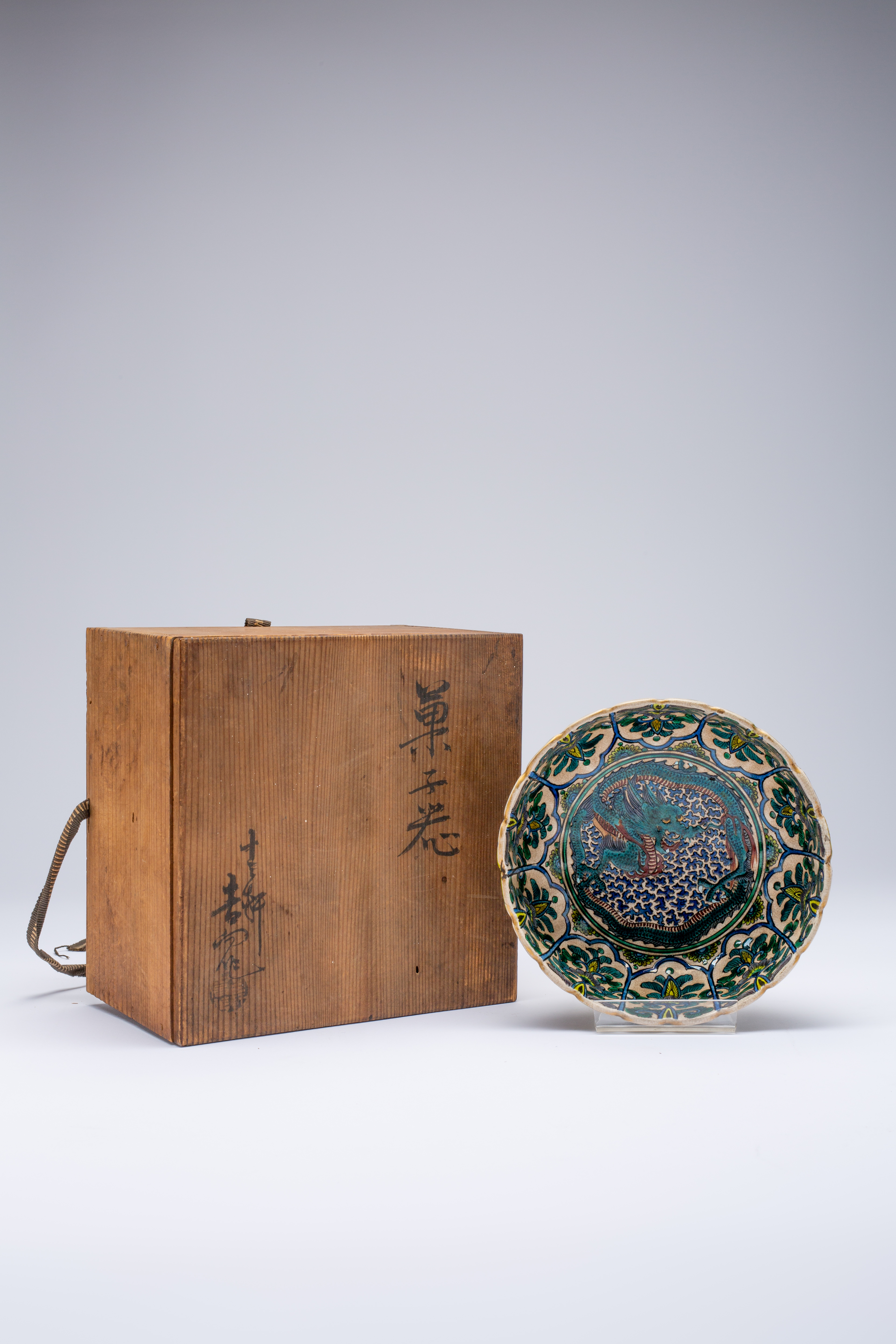 The foliate body decorated with a large three-clawed dragon to the well, the cavetto with lappets enclosing designs of flowers and leafy tendrils, the exterior with further flowerheads and formal designs, the base with a two-character mark, all rendered in thick enamels, together with an inscribed tomobako box, 15.7cm. (2)