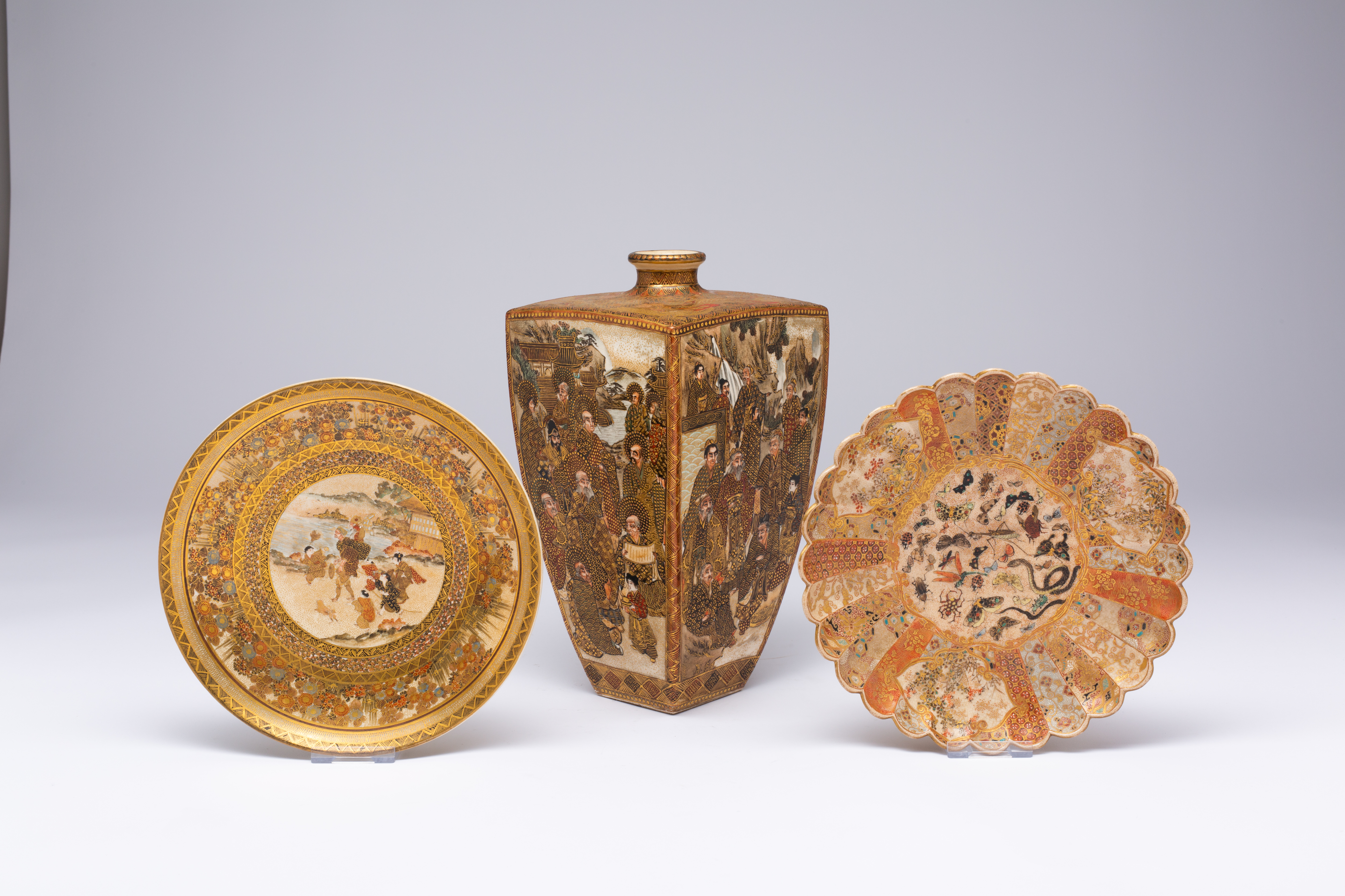 One a tall square-section vase decorated with Immortals in landscapes, with dragons and mon to the shoulder, marked Satsuma underneath; together with a foliate dish painted with many insects to the well, flowers and brocade patterns, and another dish painted with a sarumawashi carrying his pet monkey on his back while being surrounded by children, the cavetto with continuous bands of flowers, signed Gyokuzan underneath, 24cm max. (3)