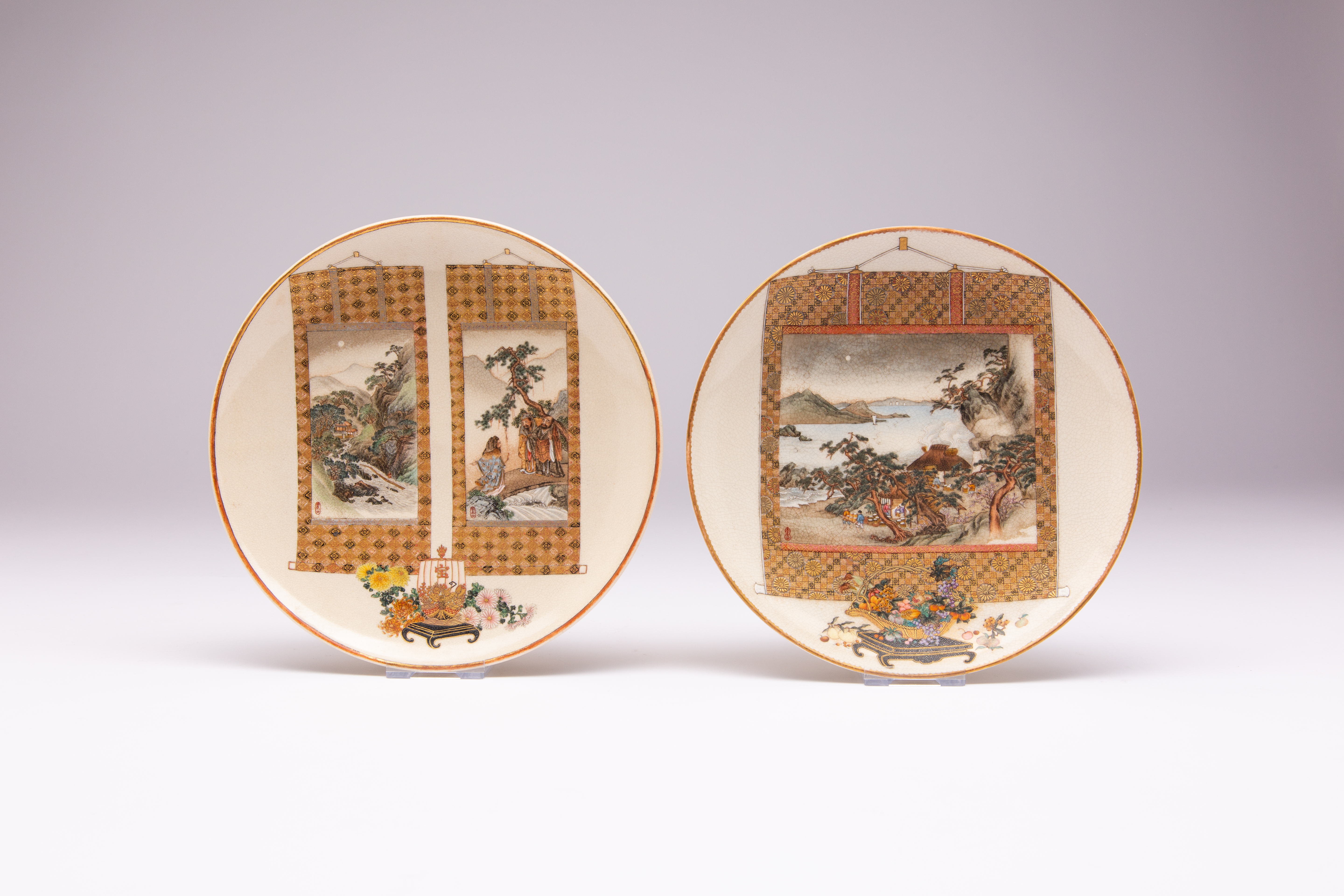 One dish decorated with a large kakemono (scroll painting) depicting thatched pavilions in a mountainous river landscape, with coopers working on barrels in and out of the buildings, the trompe l'oeil painting signed with a red gourd-shaped seal mark for Sozan and on an ornate silk mount decorated with chrysanthemum mon, a basket of fruits before it; the reverse with an elaborate mark painted as two books and flowers, a long inscription reading Dai Nihon Kyoto, Awata, Kinkozan seizo, Sozan ga; the other dish painted with two scrolls, one depicting a landscape and the other three Chinese sages, both with a red seal mark for Sozan and with a model of a takarabune (treasure boat) and chrysanthemum before them; the reverse also with an elaborate signature reading Dai Nihon Kyoto Kinkozan seizo; 18.6cm and 19cm respectively. (2)