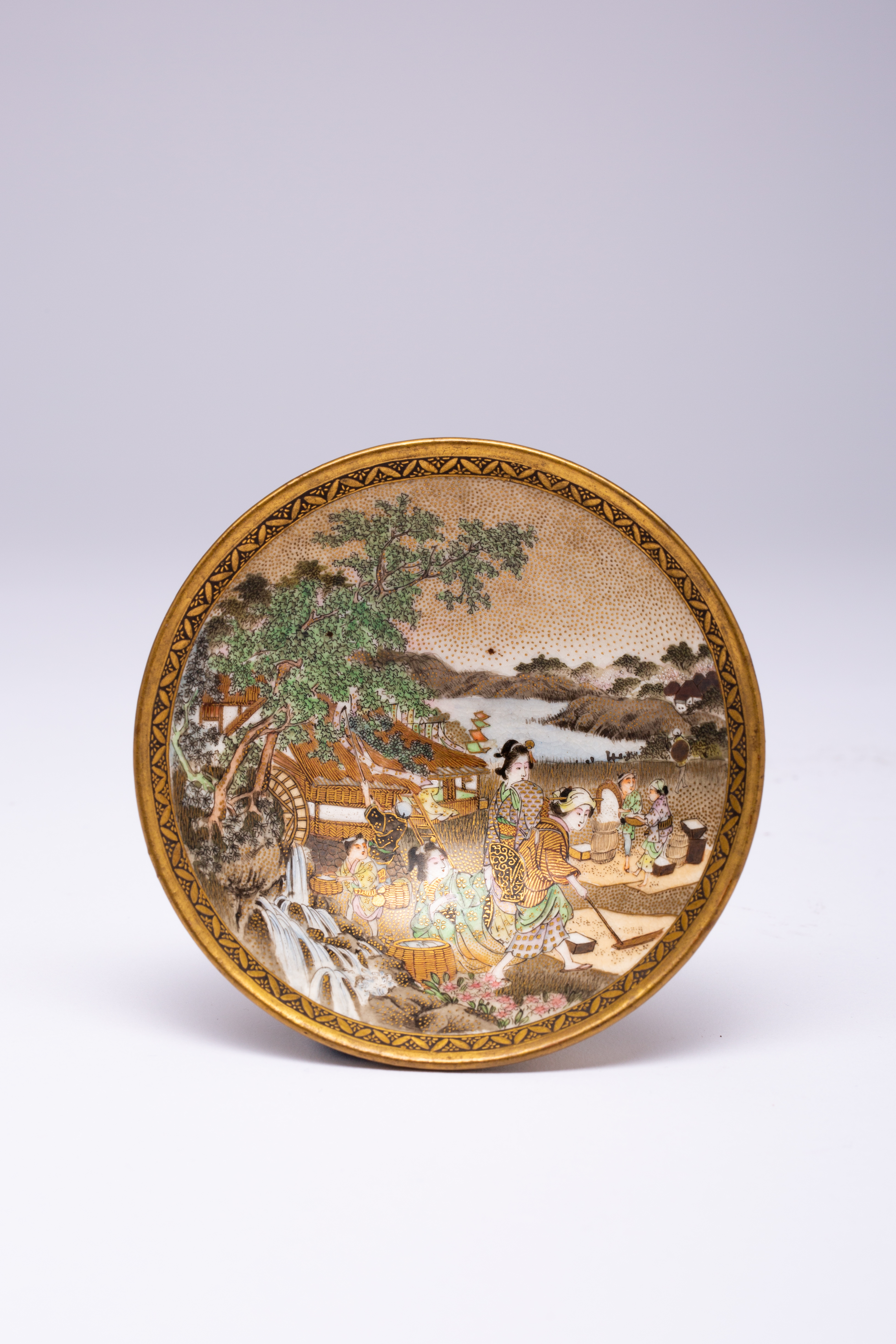 The well delicately painted with a beauty observing farmers at work, a water mill behind them; the reverse embellished with keyfret, prunus flowers and ornate medallions, signed Kinkozan in gilt and impressed Kinkozan zo, 7.4cm.