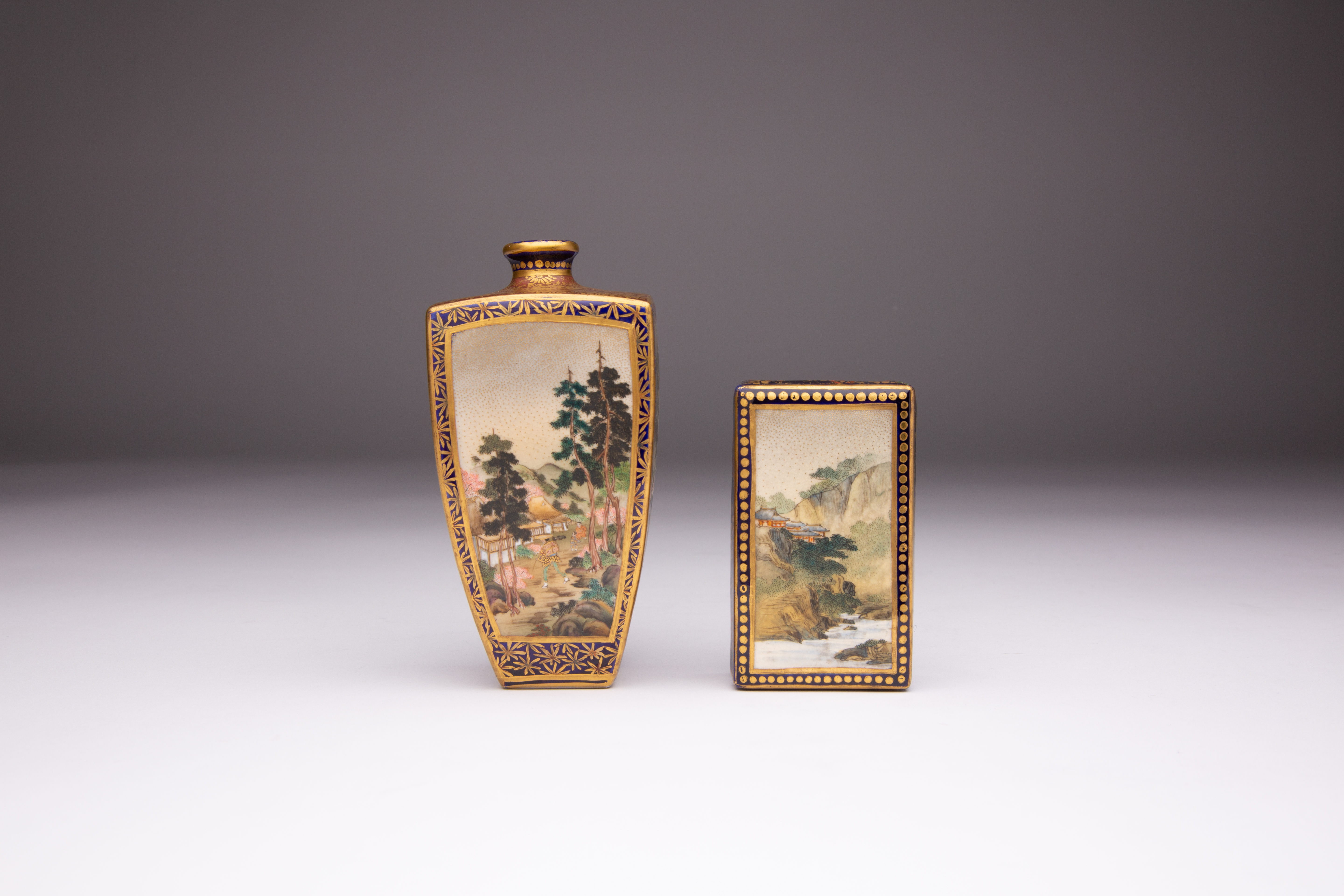The square-section vase typically decorated in polychrome and gilt with panels enclosing figures in landscapes, the shoulder with a dense pattern of butterflies fluttering amongst flowers, the base with a faint signature, possibly for Kinkozan; together with a rectangular box and cover, the lid finely painted with pavilions in a mountainous river landscape, the base signed Kinkozan zo, the vase 12cm and the box 2.8cm x 4.7cm x 8.1cm. (3)