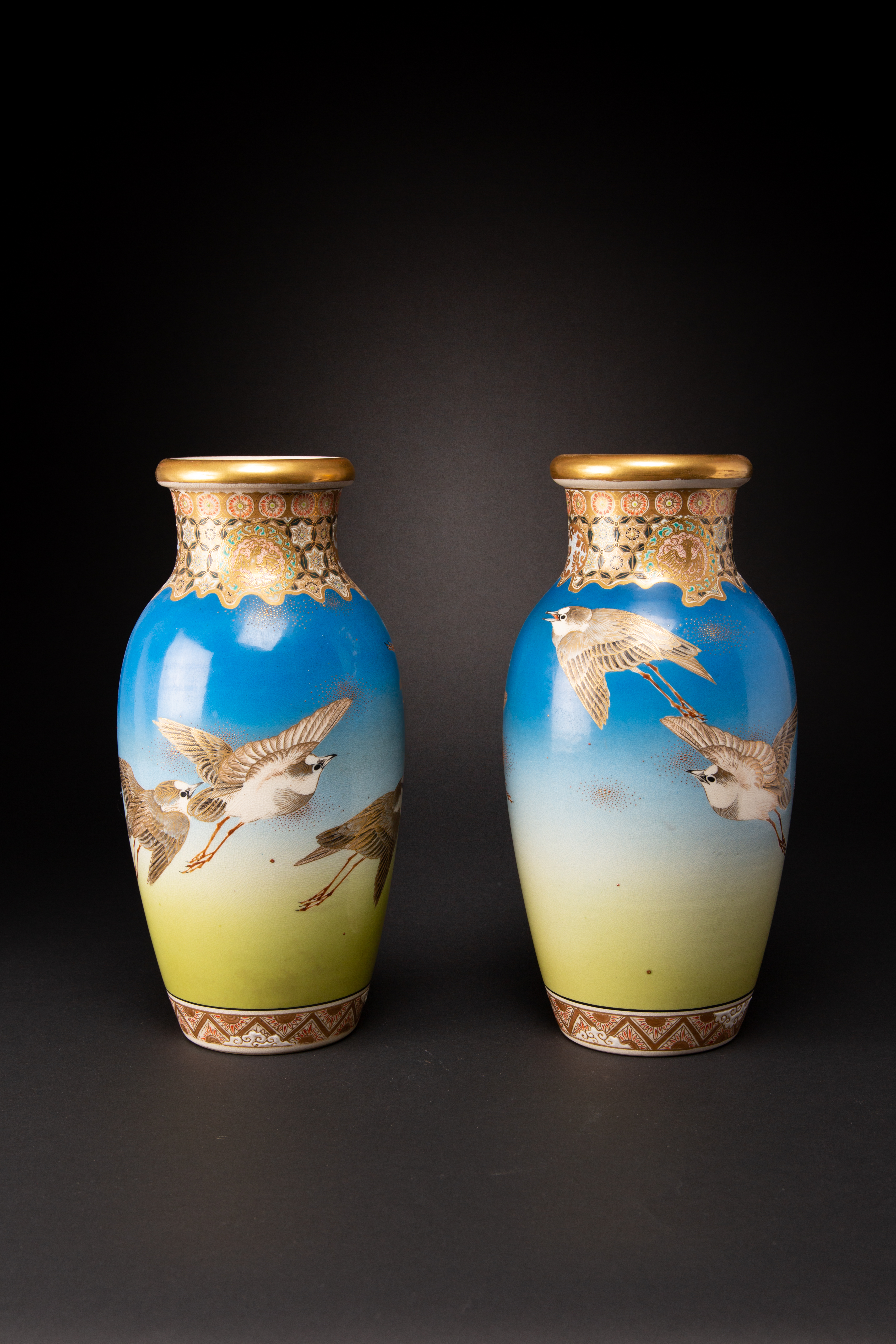 Of baluster shape, both decorated with sparrows in flight on a blue-green ground, each with borders of brocade patterns, mon and other formal designs above the foot and to the neck, each signed underneath Dai Nihon Taizan sei in black ink and with an impressed mark for Taizan, both 31cm. (2)
