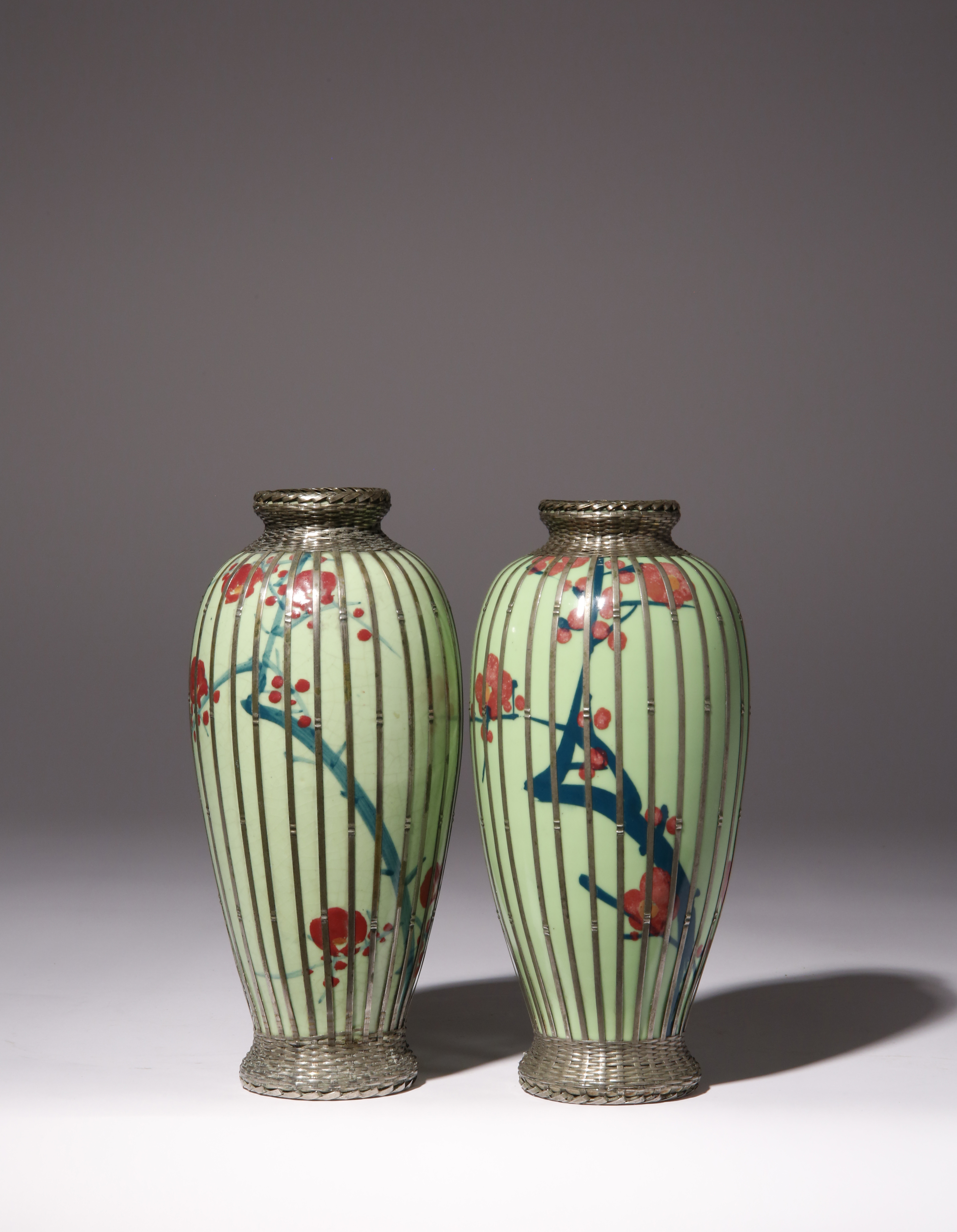 The green bodies painted with branches of prunus, encased in white metal basket-weave mounts, 22cm and 22.4cm respectively. (2)