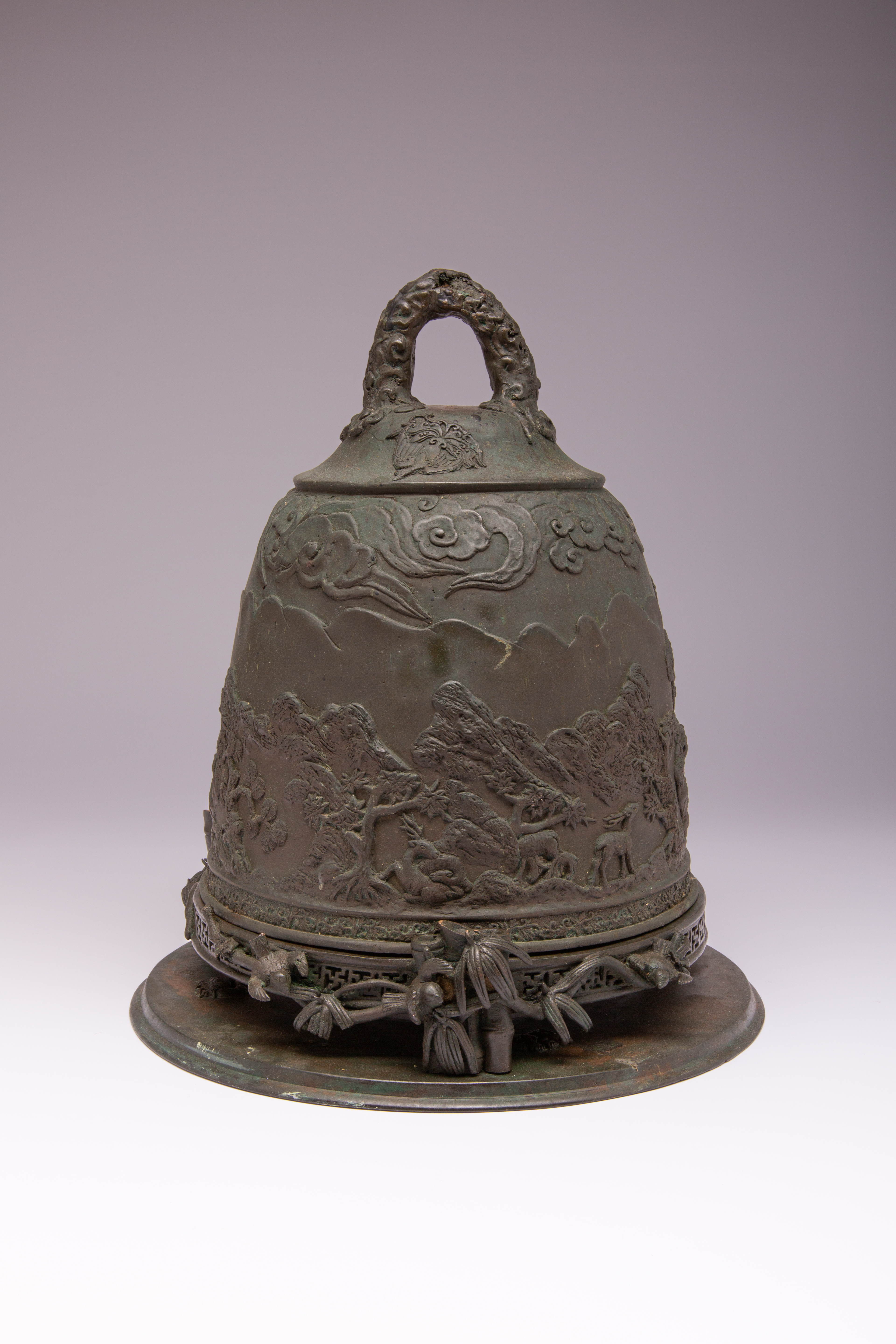 Decorated to one side with a herd of deer in a mountainous landscape, the reverse with a smoking traveller observing boats sailing into the distance, with a continuous band of scrolling clouds above and the handle similarly shaped, raised on a fitted circular bronze stand with bamboo, reticulated bands of swastika and chidori birds in flight, 37.5cm overall. (2)