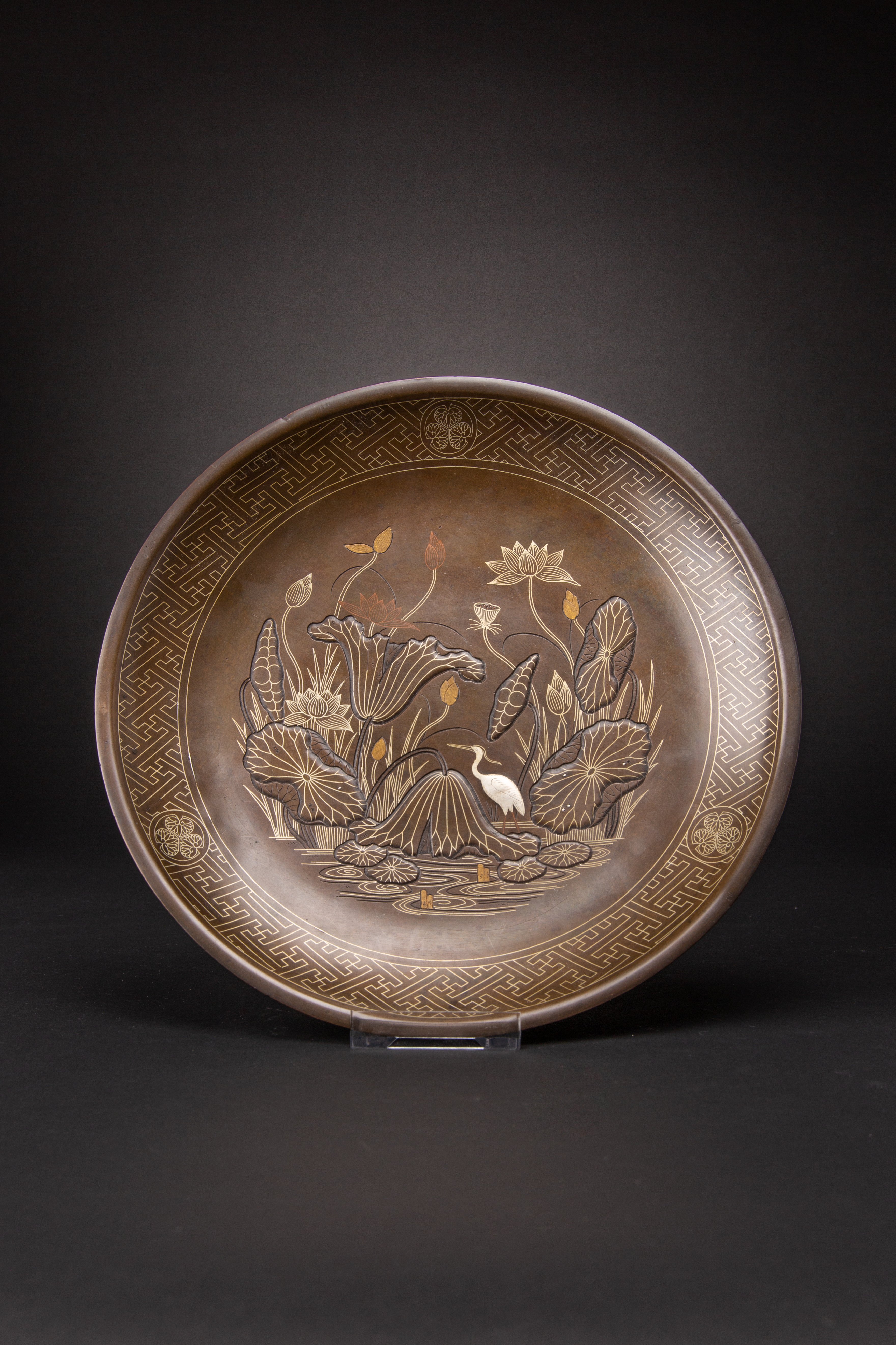 Decorated to the well with a silver crane wading amongst large lotus leaves and flowers, with details highlighted in inlaid wires of various colours, the cavetto with a band of geometric designs and three mitsuba-aoi mon (three hollyhock leaves crest) used by the Tokugawa clan, the reverse with a two-character mark, 24.2cm.