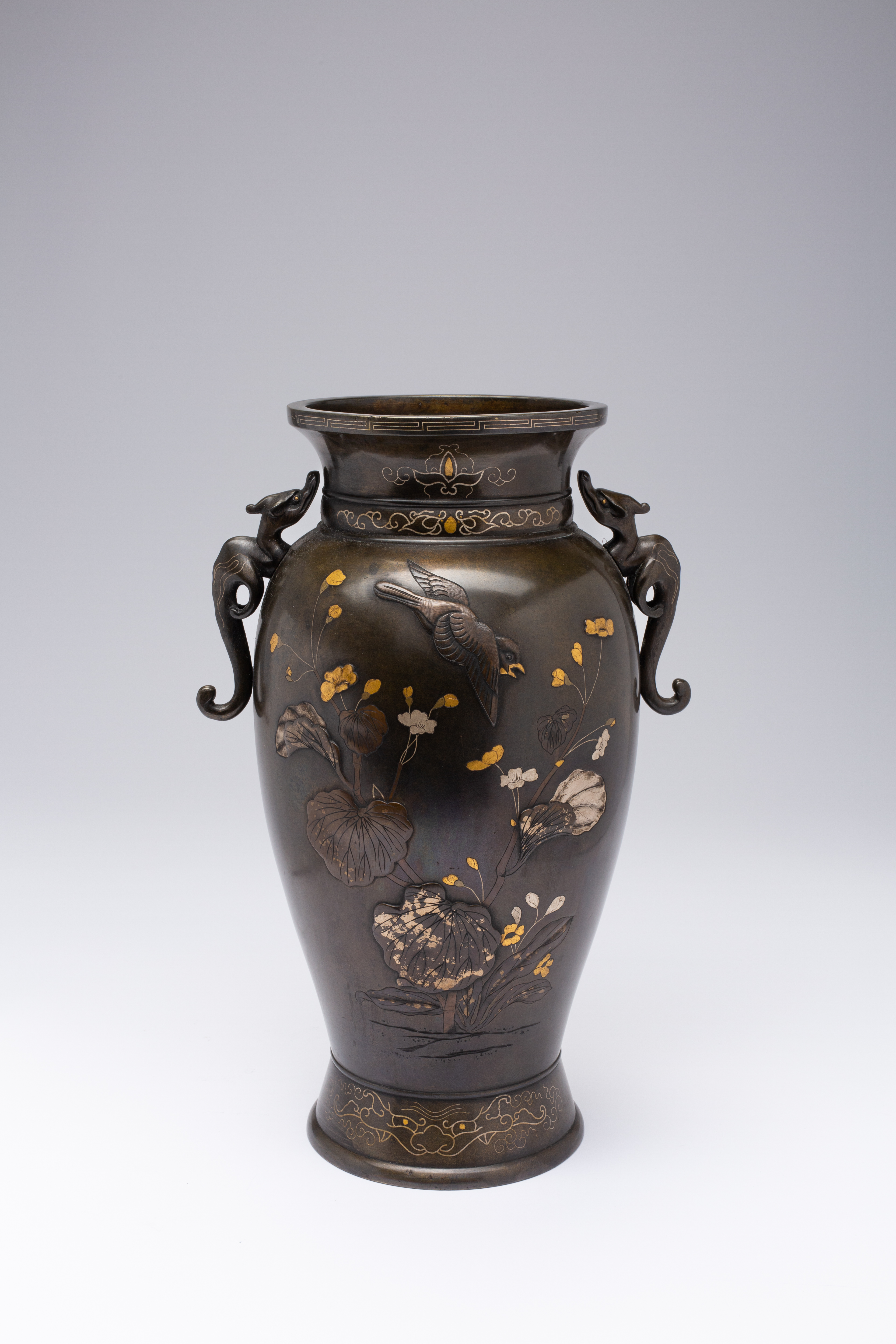 Of baluster form with a splayed foot, the shoulder applied with dragon-shaped handles, decorated to both sides with birds and flowers in low relief, with details highlighted in gilt and silver iro-e takazogan, takabori and katakiribori, the foot with two shishi masks and the neck with formal scrolling patterns in iro-e hirazogan, 30.5cm.
