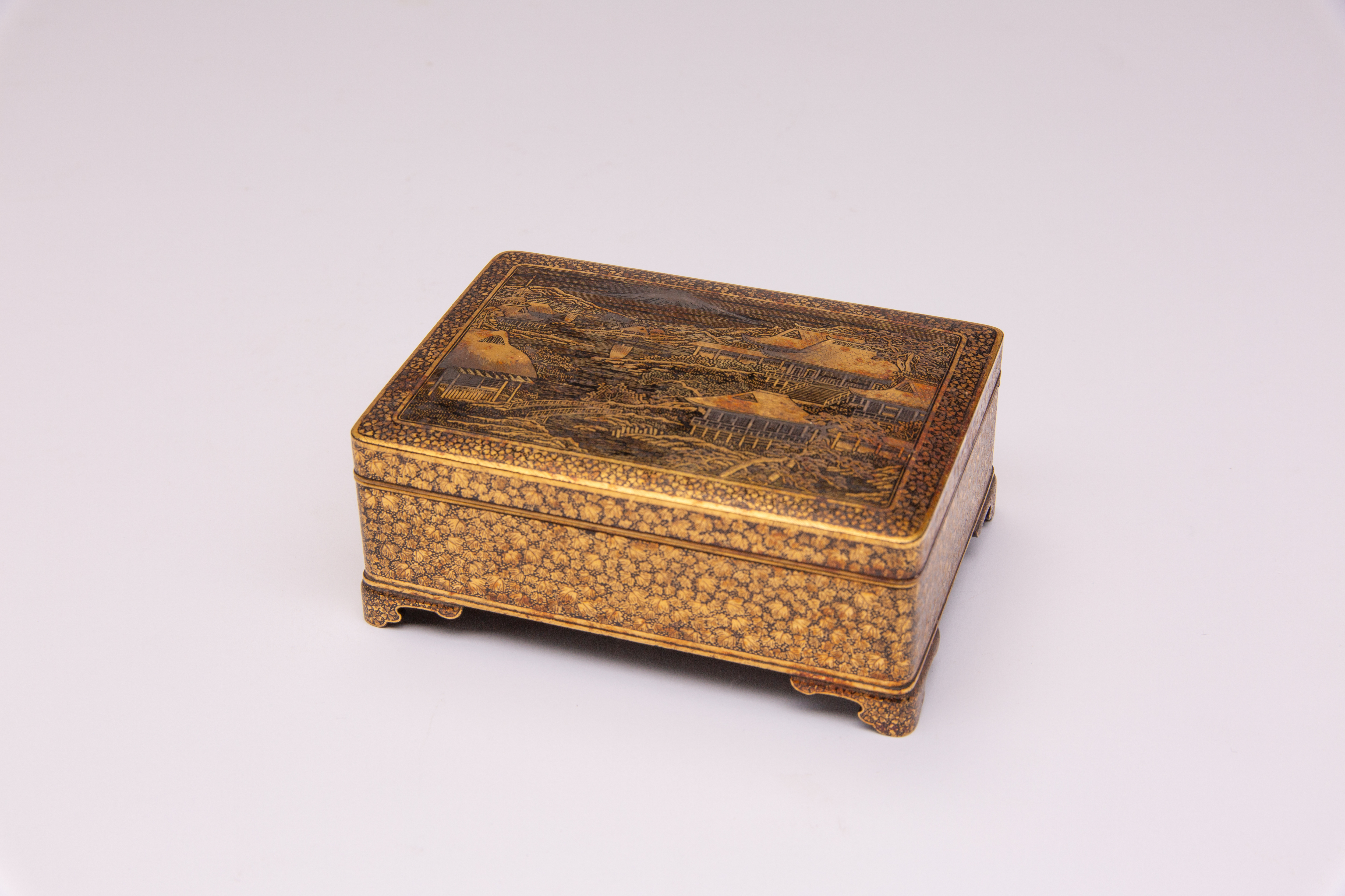 Of rectangular shape with a hinged cover and raised on four bracket feet, decorated to the top with a panel enclosing pavilions and thatched buildings in a mountainous river landscape, a silver Fuji towering in the distance; the sides with a dense pattern of vine leaves, the inside with a further depiction of Mount Fuji, the base with the dragonfly mark for Komai Otojiro of Kyoto (1842-1917) and sealed Nippon koku Kyoto ju Komai sei, 4.5cm x 10.5cm x 7.4cm.
