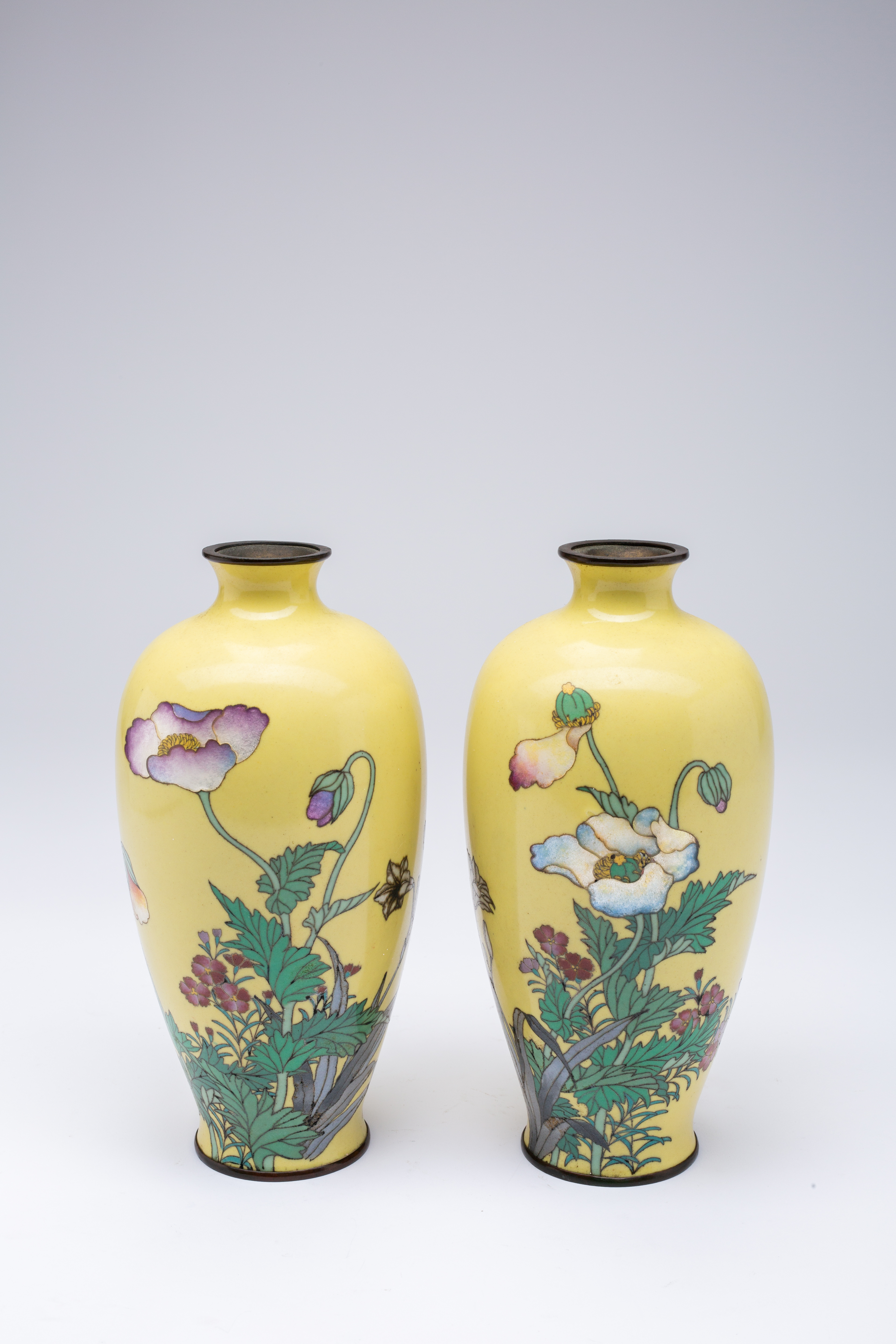 With tall baluster bodies, decorated with large poppies and other flowers on a canary-yellow ground, some petals rendered in foil, both with a stamped flower mark underneath for Tsukamoto Hikokichi, both 18.2cm. (2)