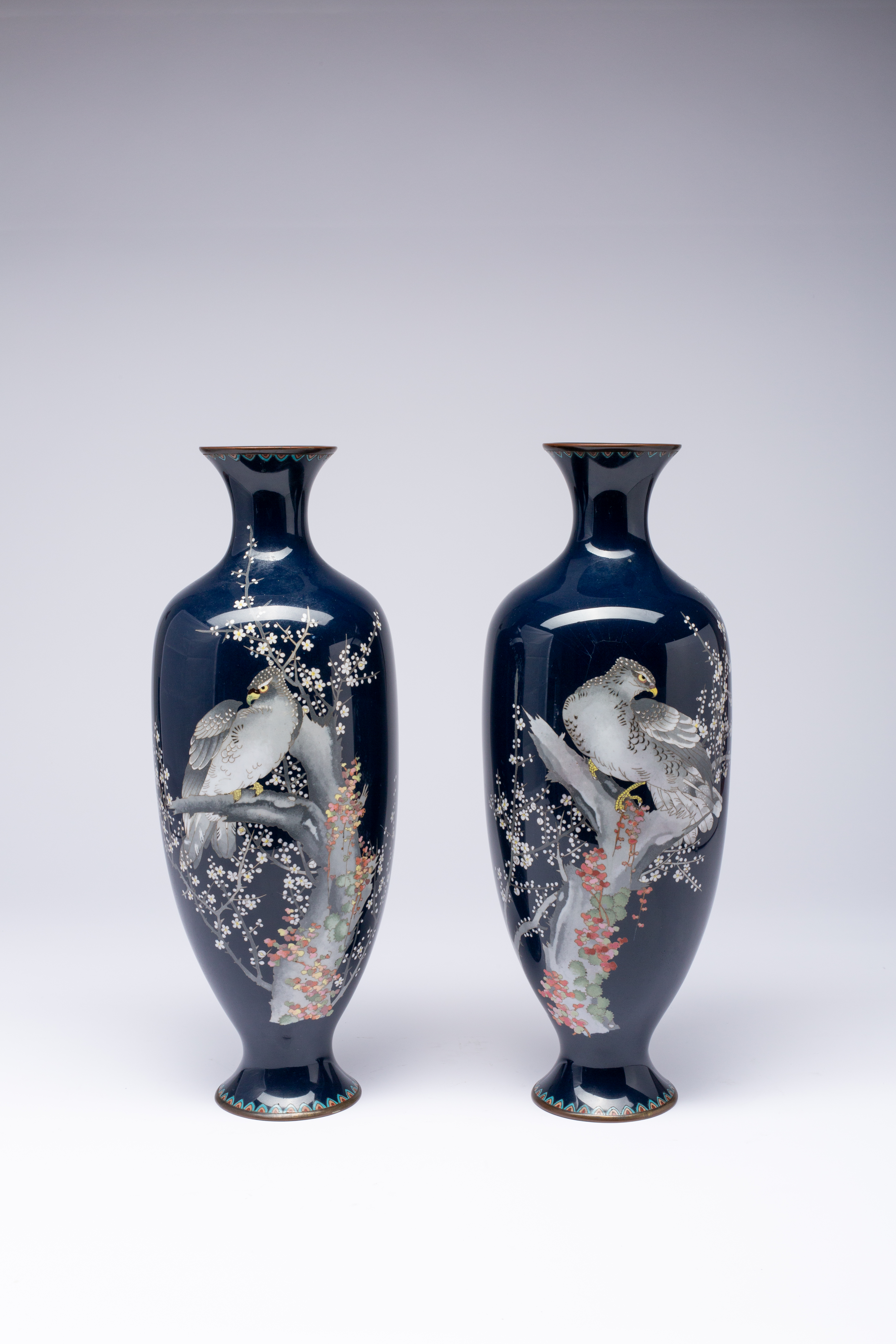 Of tall baluster shape, each decorated with a large bird of prey perched on a branch of flowering prunus, on a deep midnight-blue ground, both vases with bands of triangular lappets above the foot and under the rim, both 38.5cm. (2)