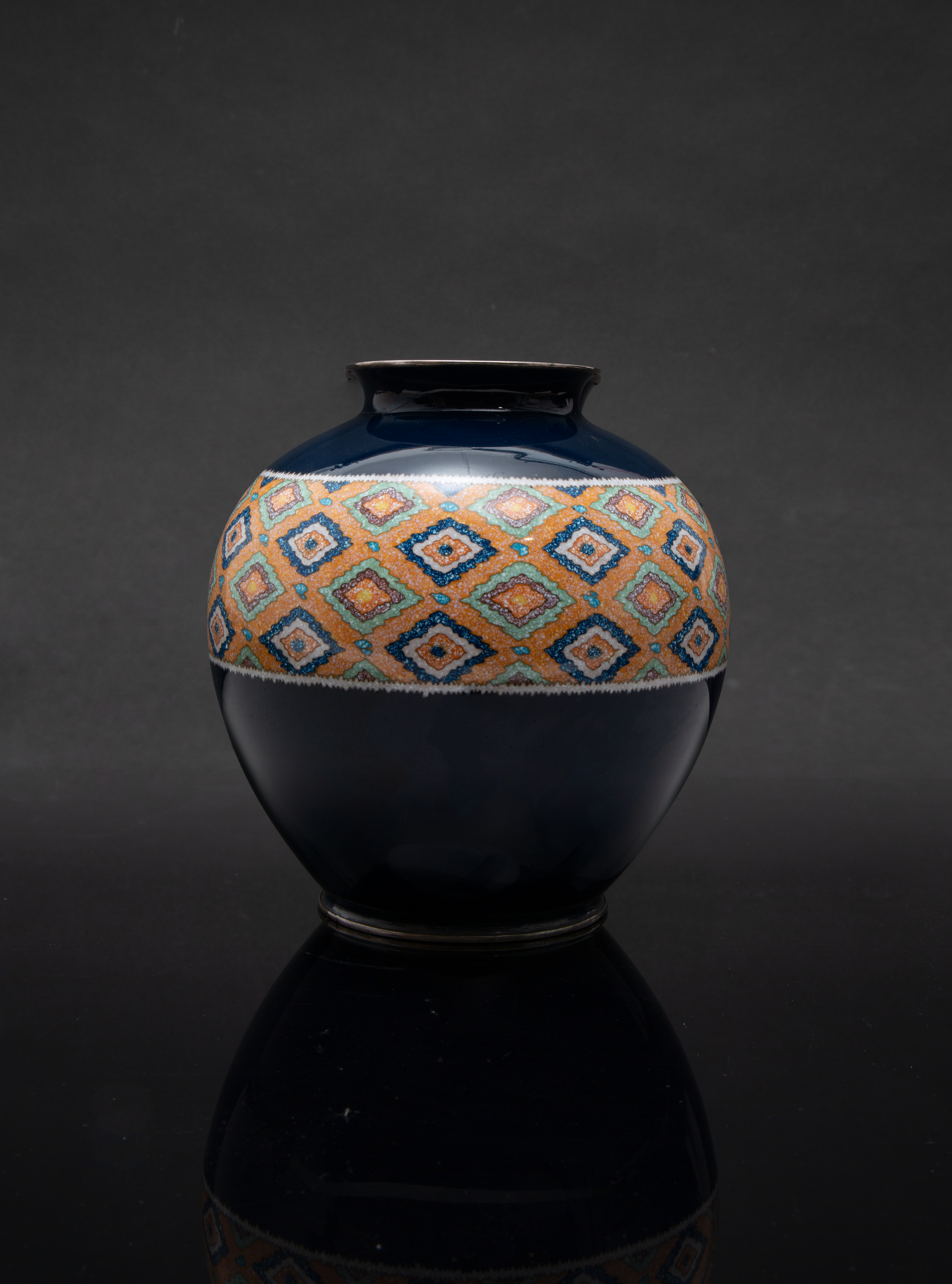 Of bulbous shape, decorated with a band of rhomboid patterns in a variety of colours on a deep midnight-blue ground, the rims with silver mounts, the one to the foot impressed 'SILVER', the base with a two-character mark reading Hayashi Tani for Hayashi Tanigoro, 17cm.