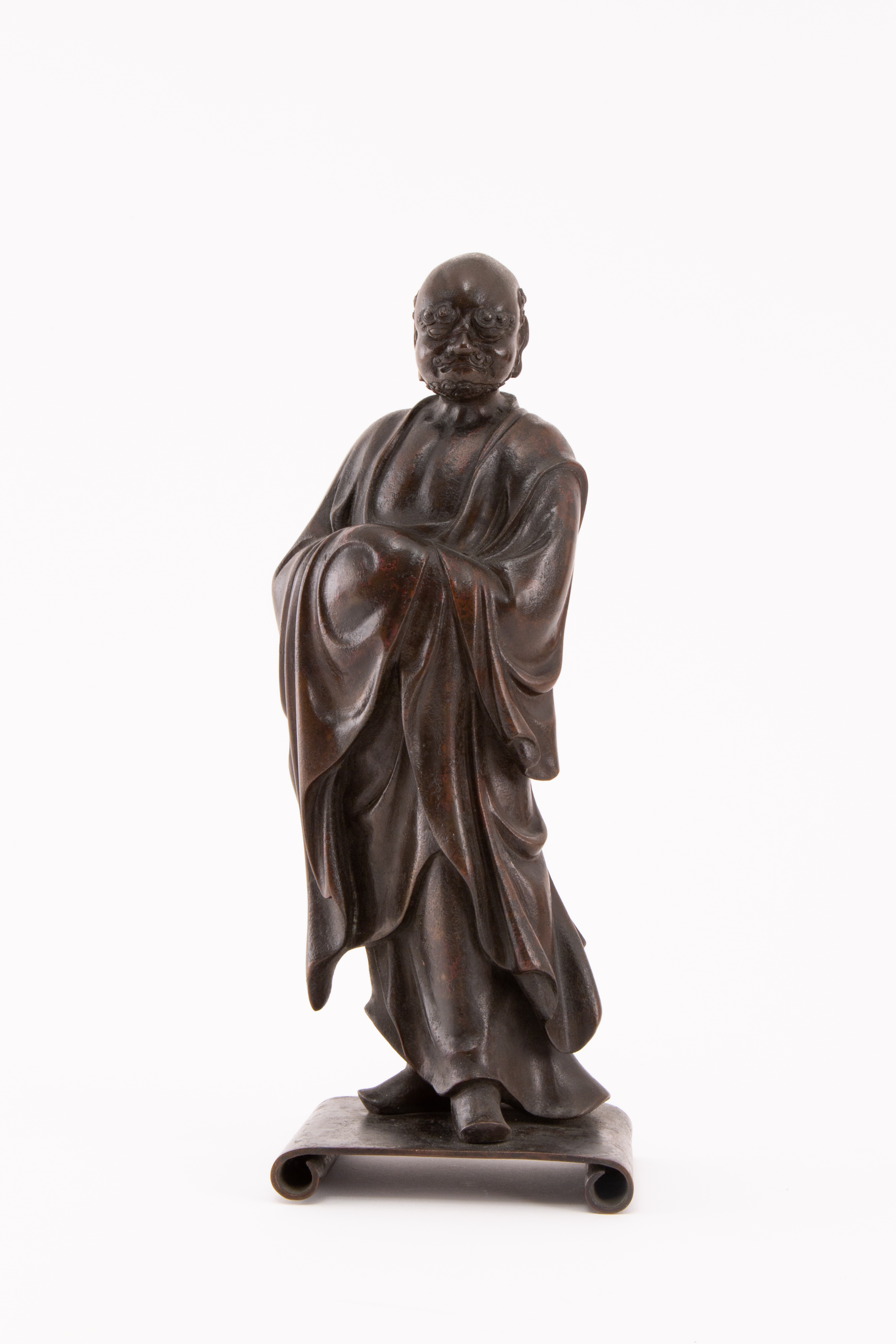 The Father of Zen Buddhism is depicted standing, wearing long flowing robes opening to reveal his bare chest, raised on a scroll-shaped stand, 31cm.