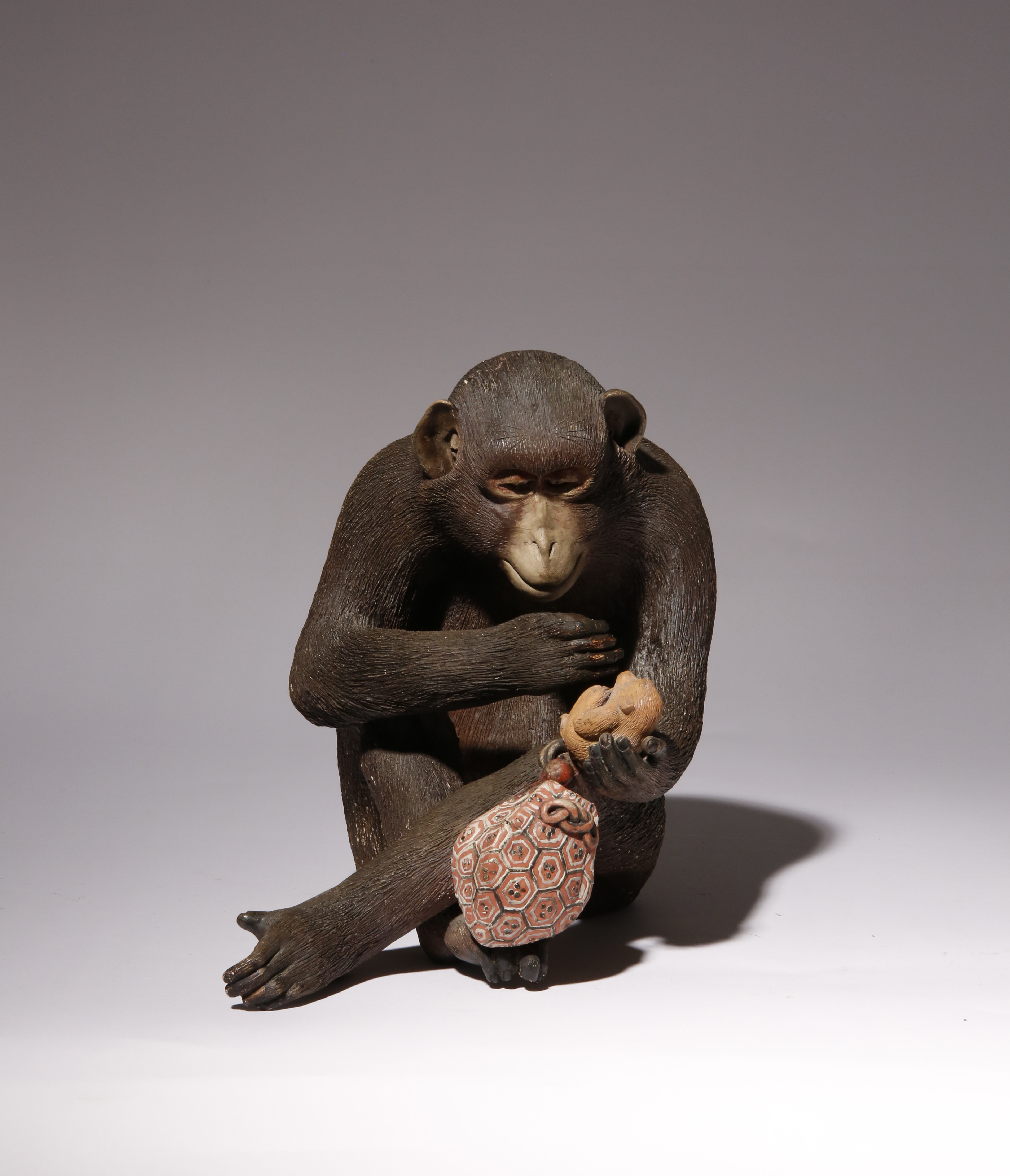 A JAPANESE POTTERY OKIMONO OF A MONKEY
