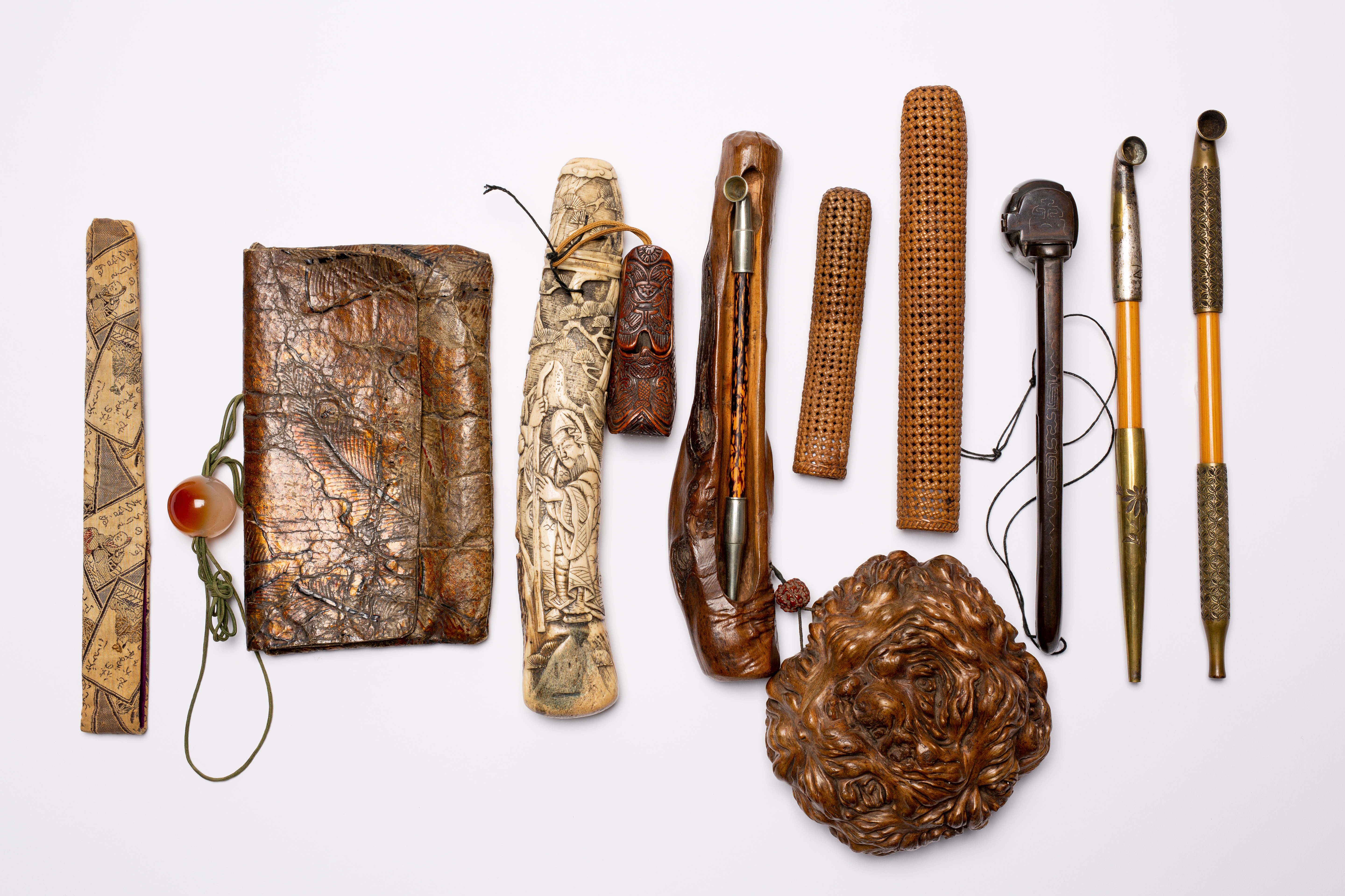 Comprising: three bamboo and metal kiseru (pipe), one in a fabric pouch; a tooled leather tobacco pouch; a woven rattan kiseruzutsu (pipe case); another made of stag antler carved with an Immortal, attached to a wooden shoe-shaped tabako-ire (tobacco box); a third kiseruzutsu made of wood and attached to a burr tabako-ire; together with an inlaid bronze yatate (writing set), 21cm max. (9)