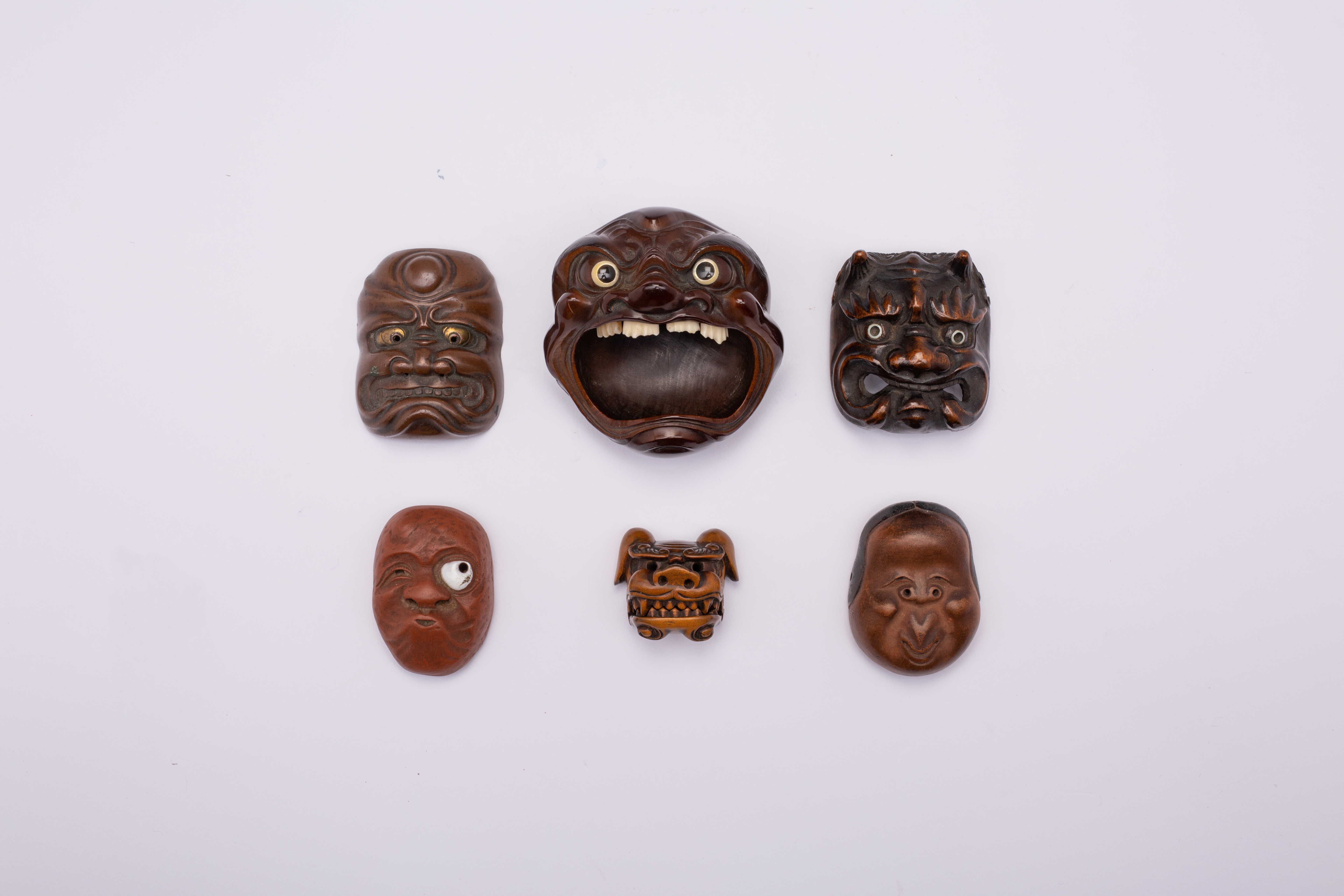 Comprising: a large ashtray carved as a demonic face with its mouth wide open; two pottery netsuke, one of Usofuku and the other of Okame, both signed; a metal netsuke of a grimacing face; and two wood netsuke, one of a horned oni and the other of a lion dog for the shishimai dance, with movable lower jaw, signed, 6.8cm max. (6)