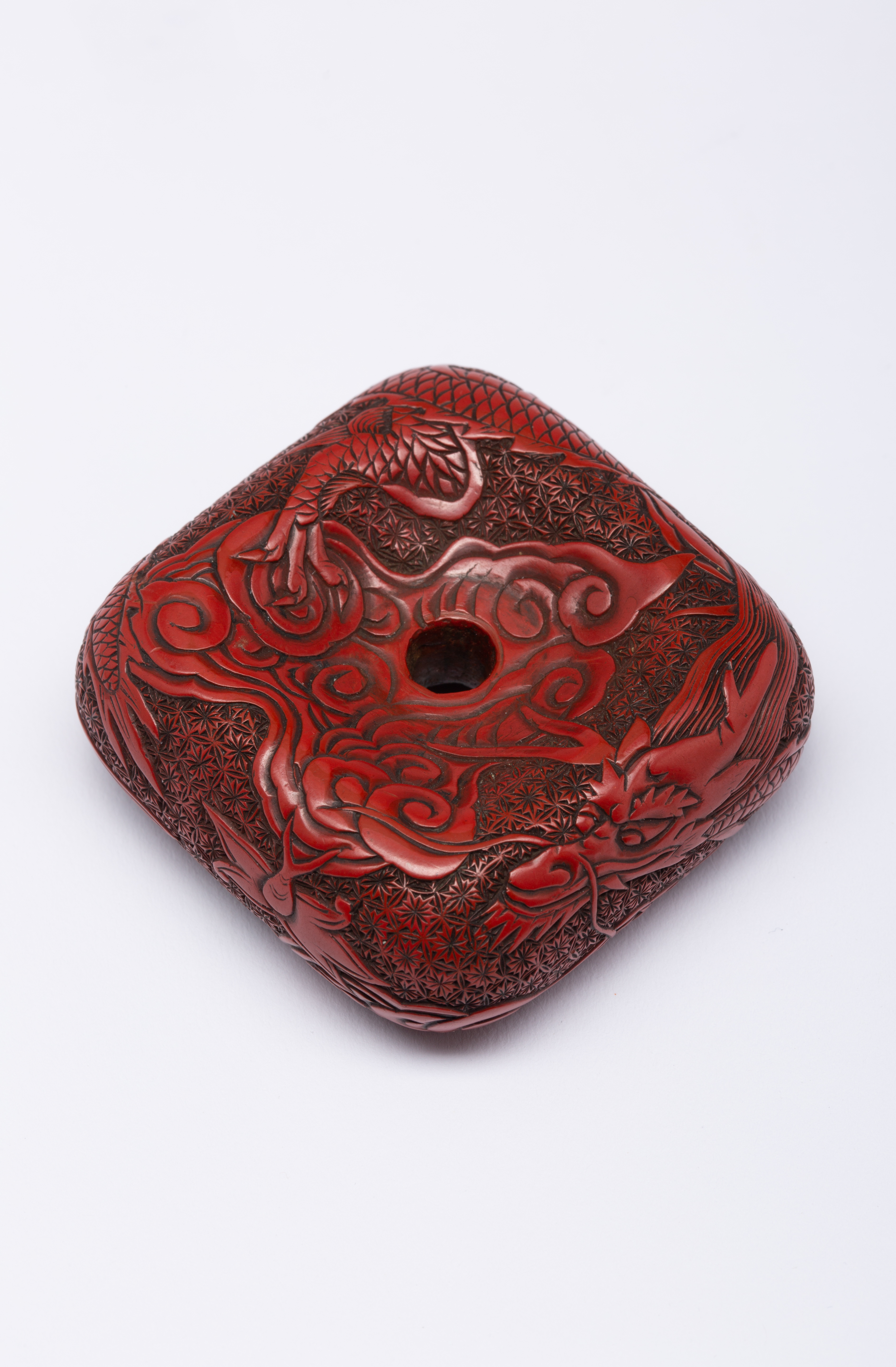 Of flattened square form and with rounded corners, decorated with a scaly dragon amongst scrolling clouds, on a dense diaper ground, 4.4cm.