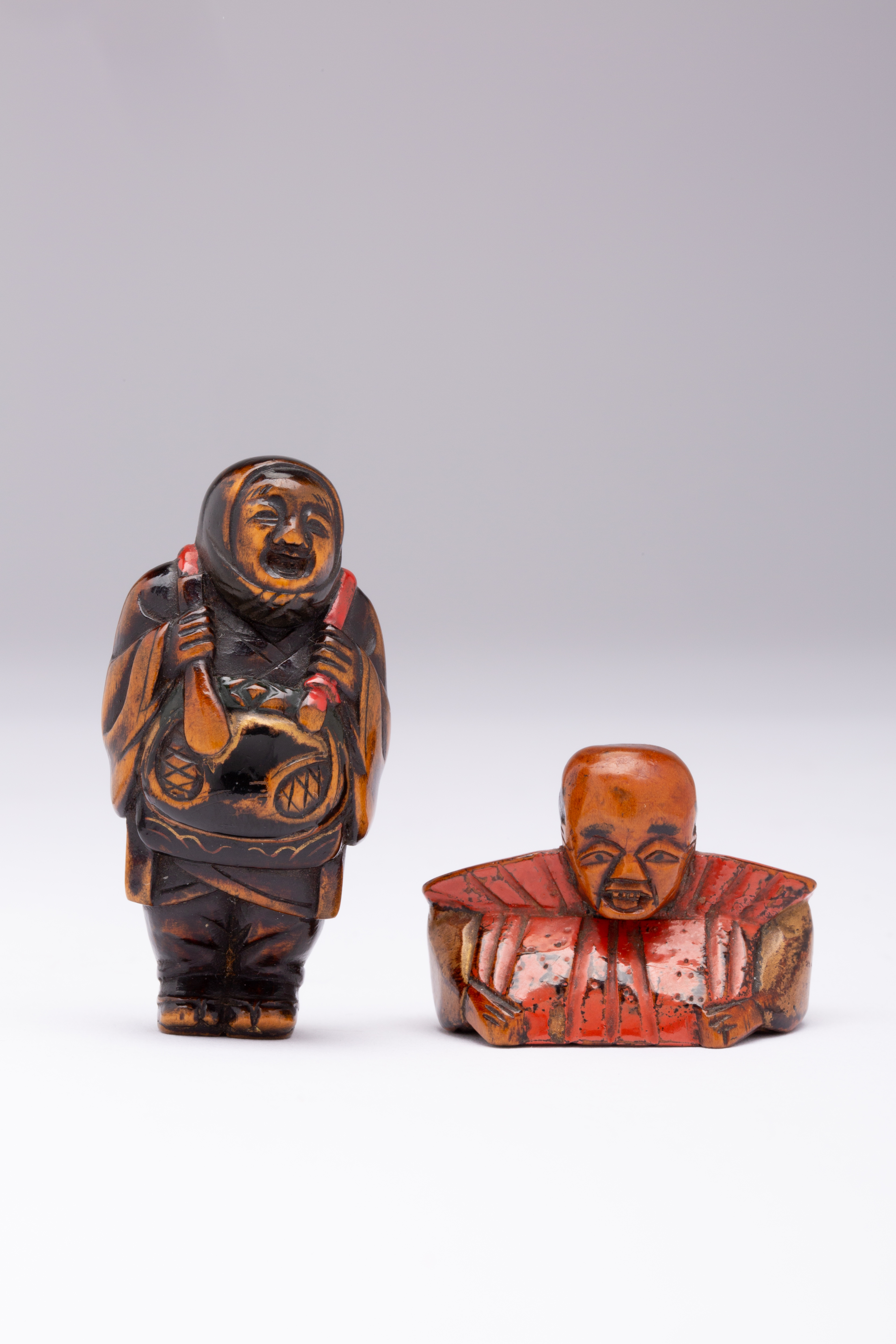 The taller one depicting a Shinto priest carrying a large mokugyo bell around his neck, and with a beater in one hand; the other netsuke carved as a kneeling man with a red angular coat, both with details in red lacquer and gilt; 5.3cm and 3.7cm respectively. (2)