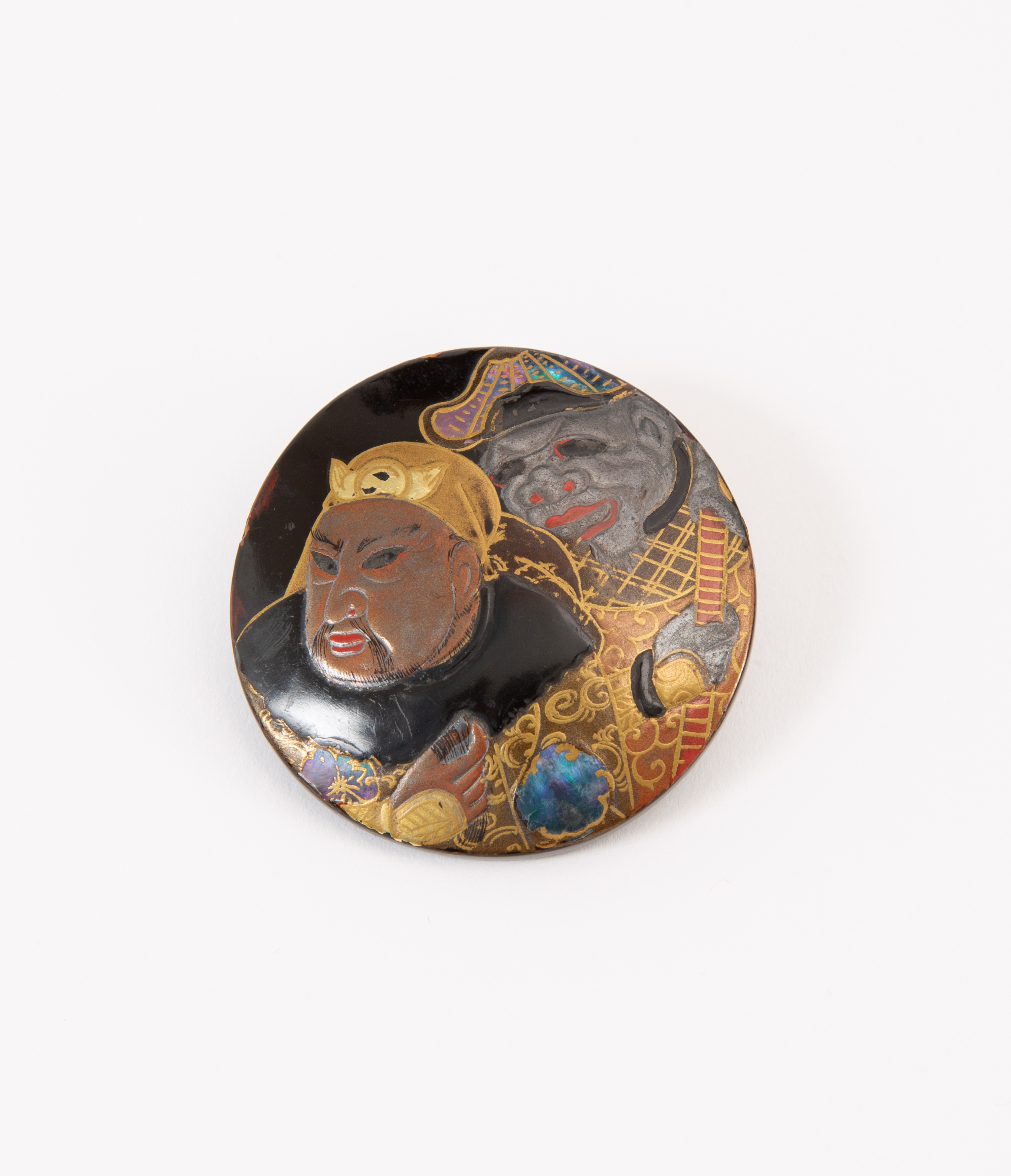 Decorated to the front with two figures, possibly the Chinese general Kan'u and a foreigner, the design rendered in gold, silver, iro-e togidashi maki-e and with mother of pearl inlays against the glossy black ground, 4.5cm.