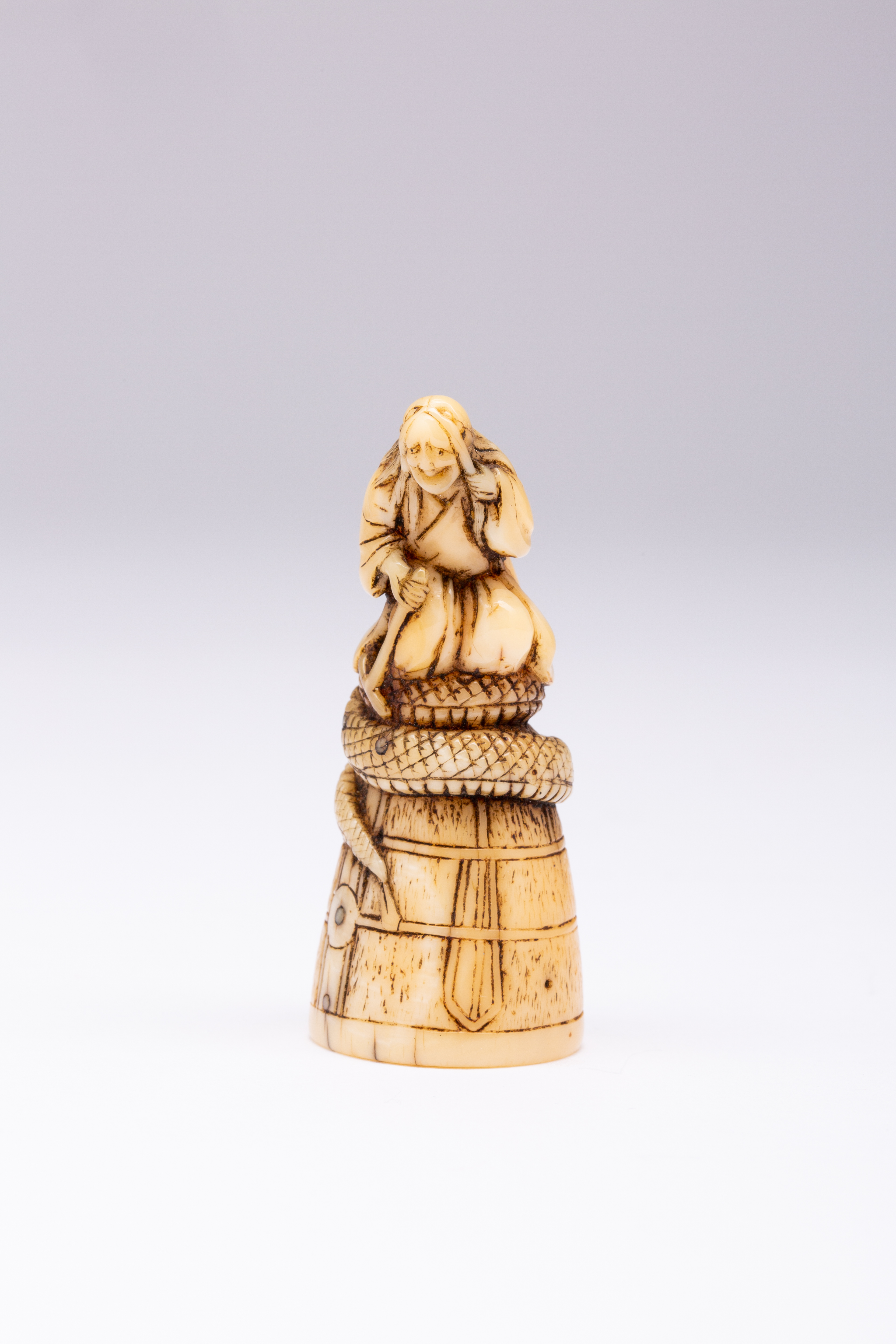 A JAPANESE TOOTH NETSUKE OF KIYOHIME ON THE DOJOJI BELL