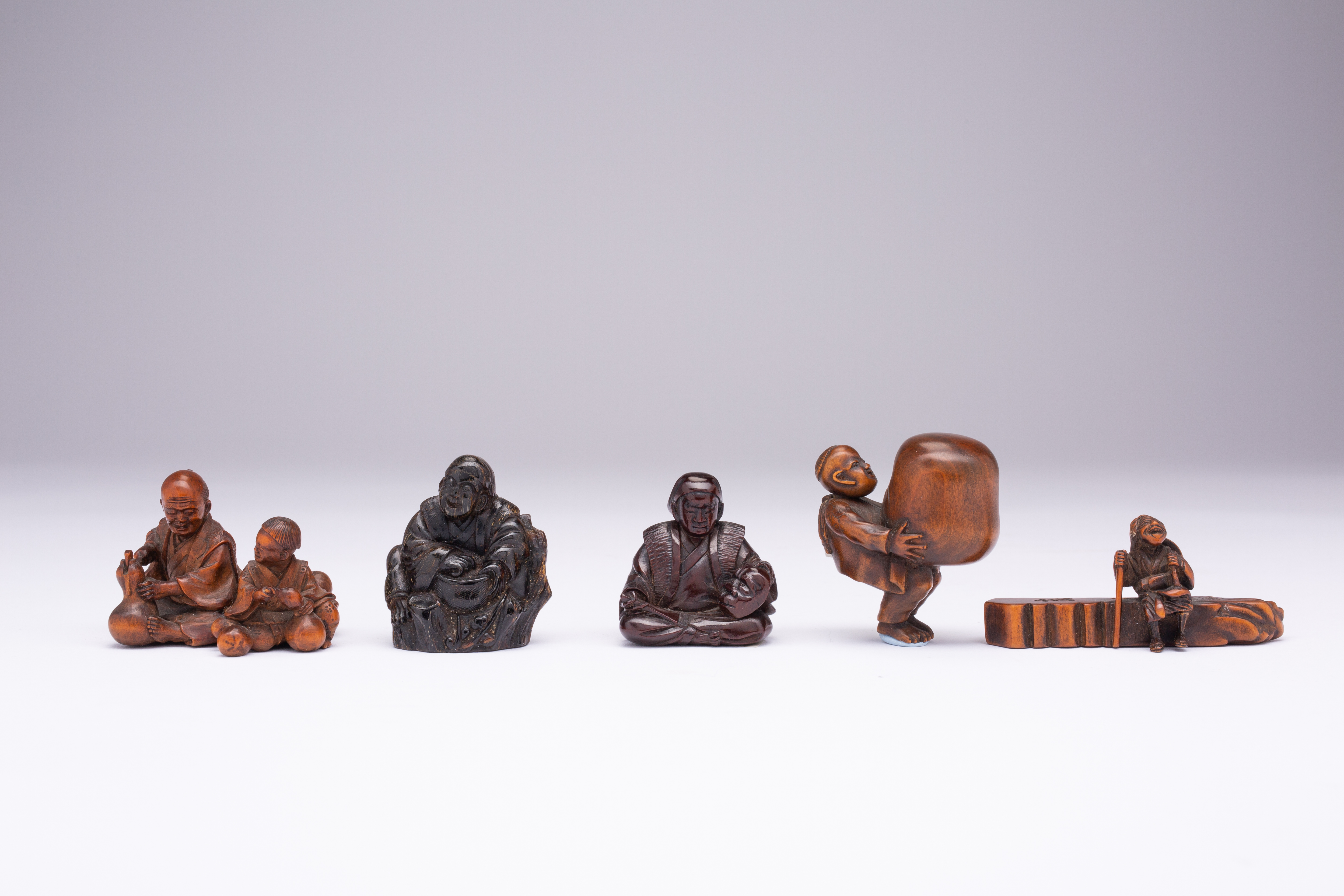 All depicting figures engaged in various activities: one an elderly man and a child opening up double-gourds; another depicting Ono no Komachi as an elderly woman resting on a toppled wood post, inscribed underneath; the third a seated craftsman painting a mask; all three signed; and the fourth a boy lifting a large Daruma doll; together with a compressed horn netsuke of a boy with a basket, 6.2cm max. (5)
