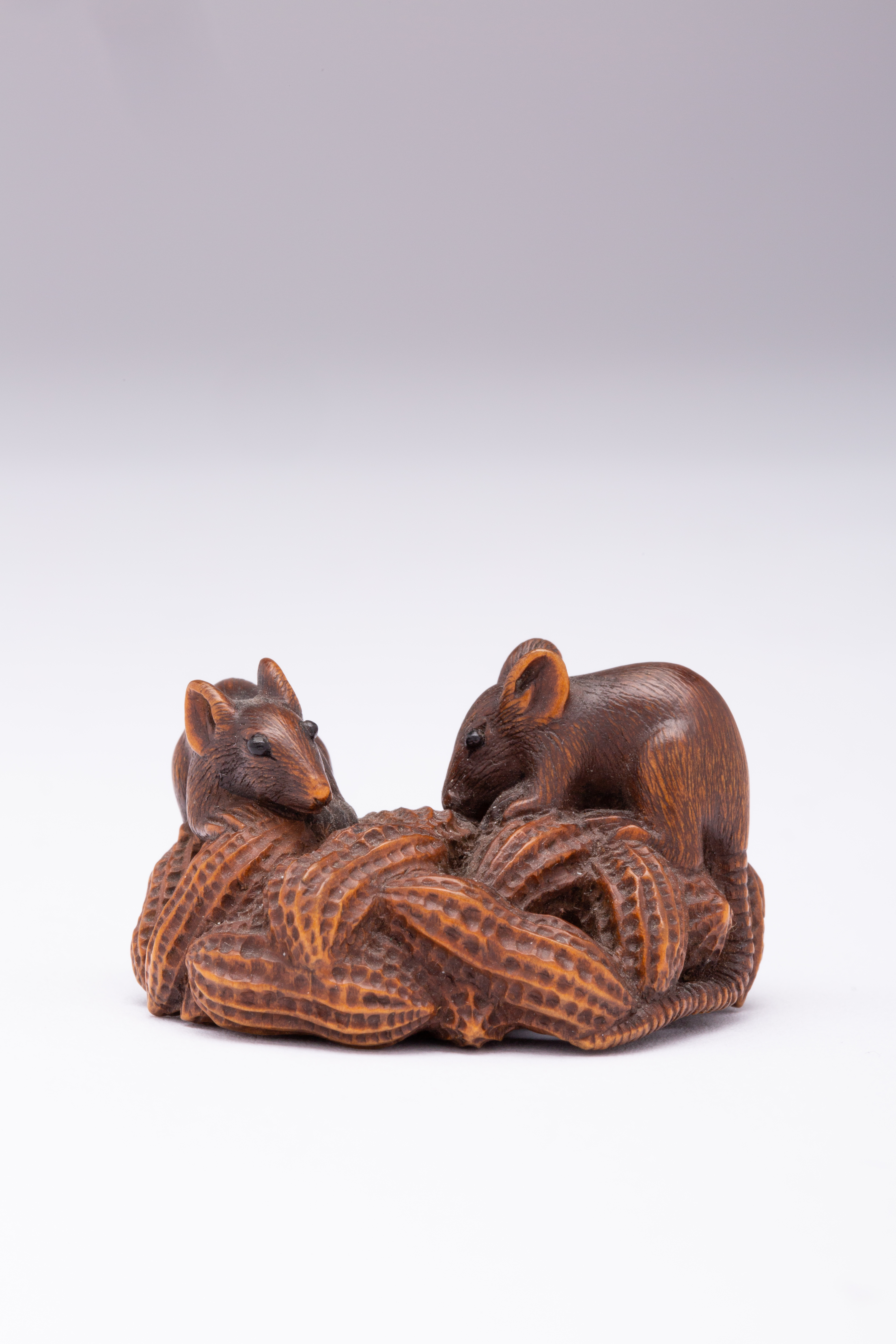 Carved as two small rats on a cluster of peanuts, one gnawing on the nuts, their hair finely rendered and with their eyes inlaid in dark horn, signed Masanao underneath with kao (for Masanao of Yamada, Ise Province), 3.9cm.