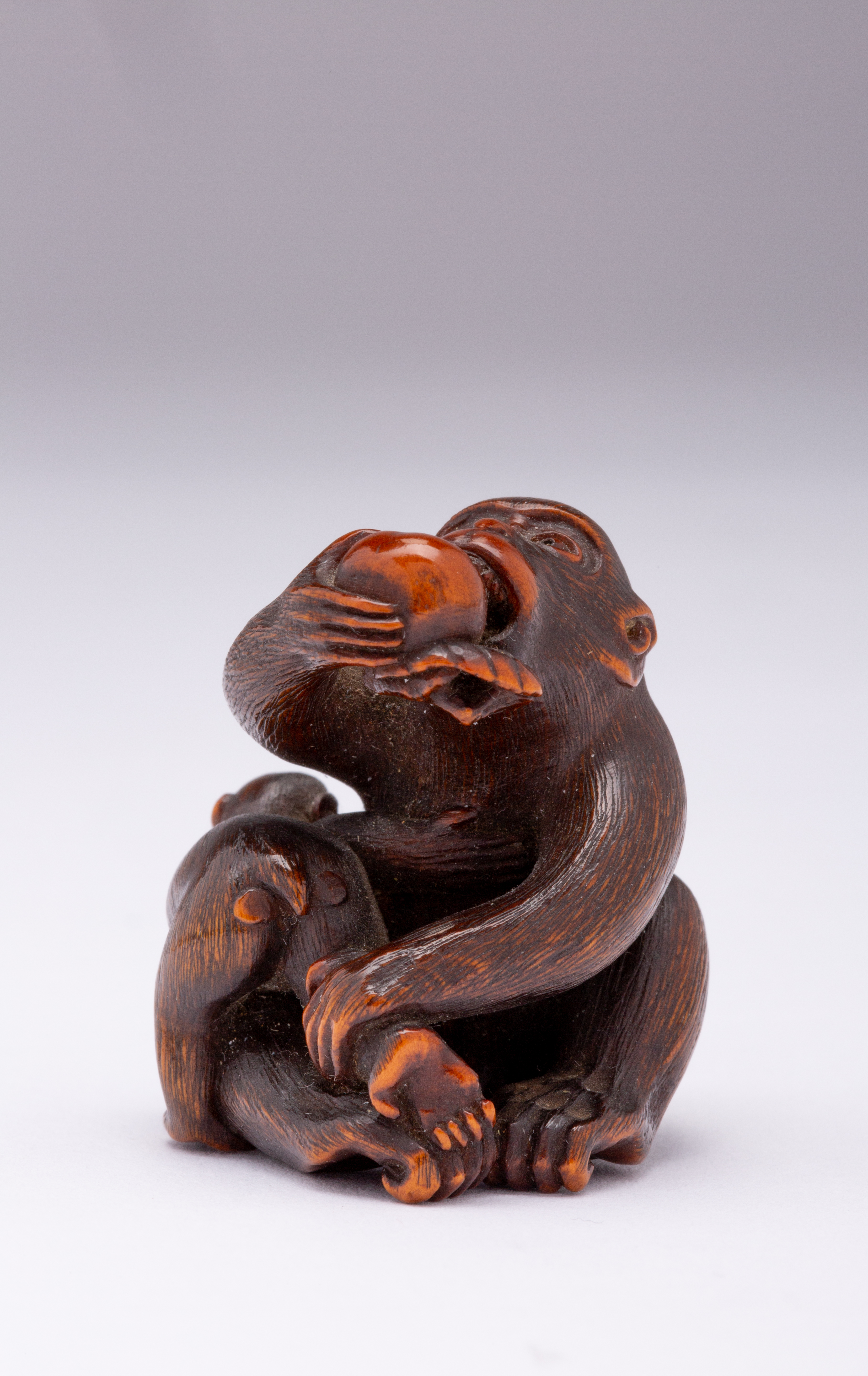 Carved as an adult and its young, the larger primate seated and biting into a large peach, the smaller one stretching to look toward the back, the base signed Masanao (for Masanao of Yamada, Ise Province), 3.5cm.
