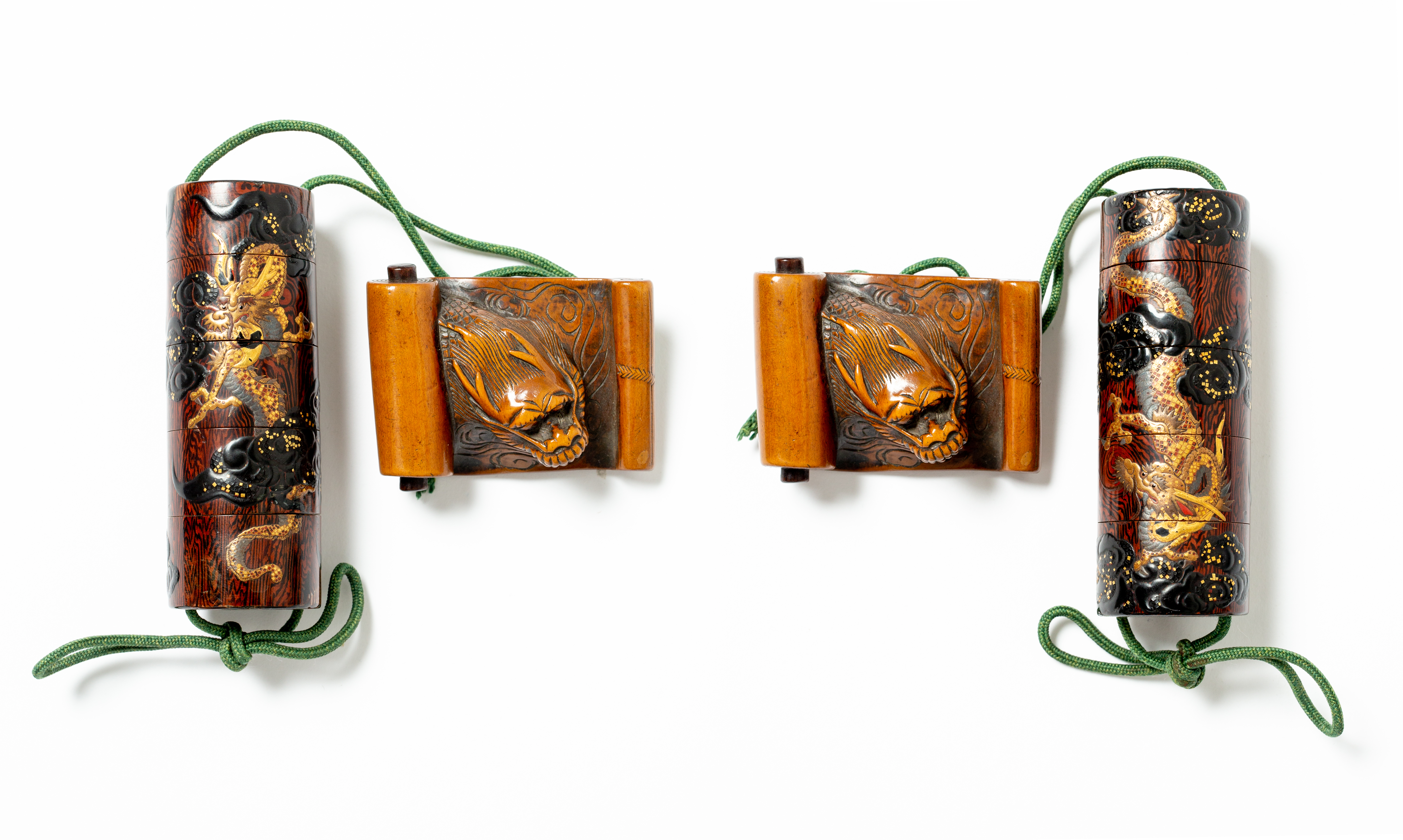 Decorated with two scaly dragons writhing amongst scrolling clouds, the decoration rendered in gold, silver, black and red lacquer, the background painted en trompe l'oeil to simulate wood grain, with a wood netsuke carved as a dragon emerging from a makimono (handscroll painting), signed, the inro 7.5cm.