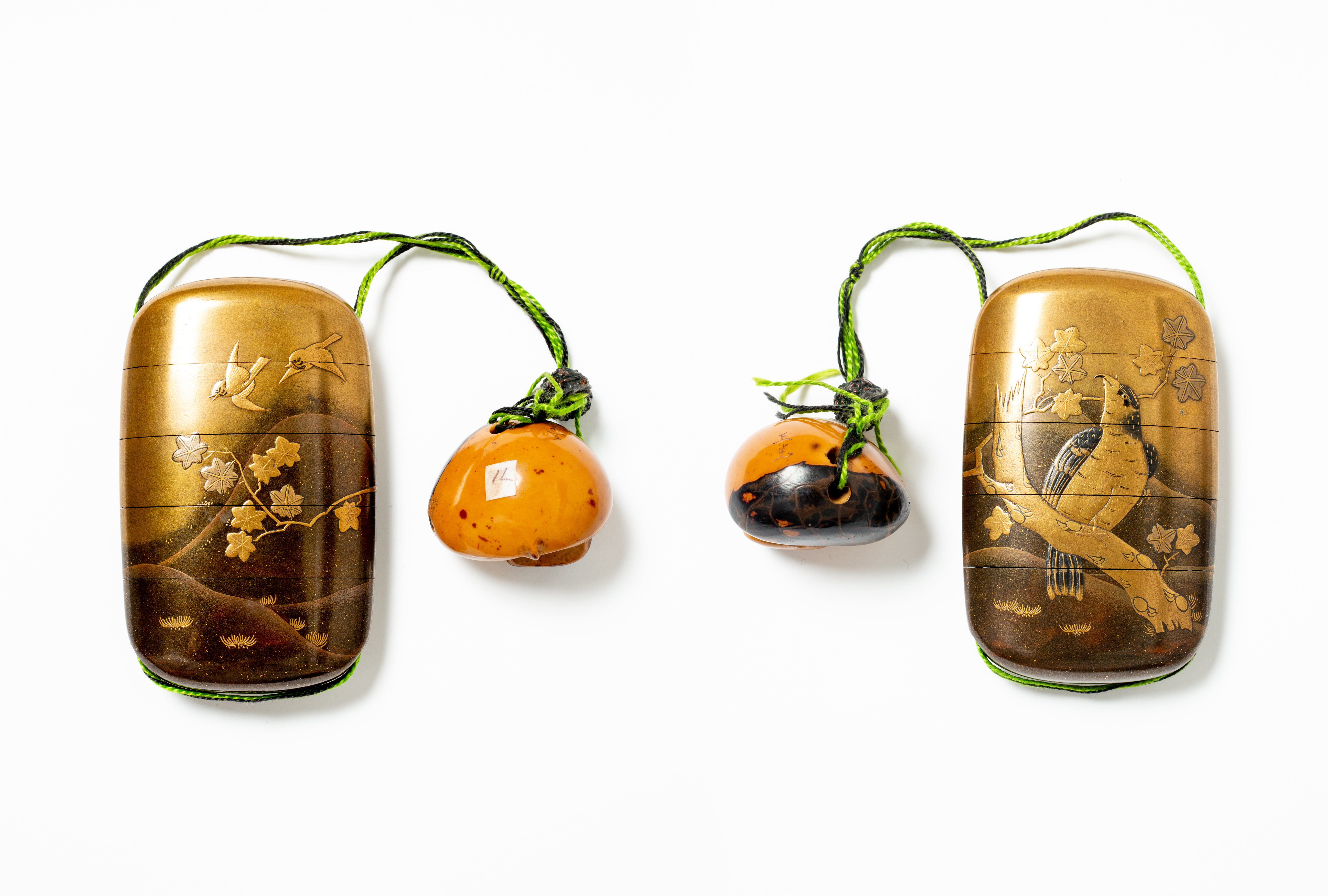 Decorated to one side with a hawk perched on a leafy maple tree, the reverse with two chidori birds in flight, with details rendered in black and gold lacquer, together with a corozo nut netsuke carved as two chestnuts, the inro 8.7cm.