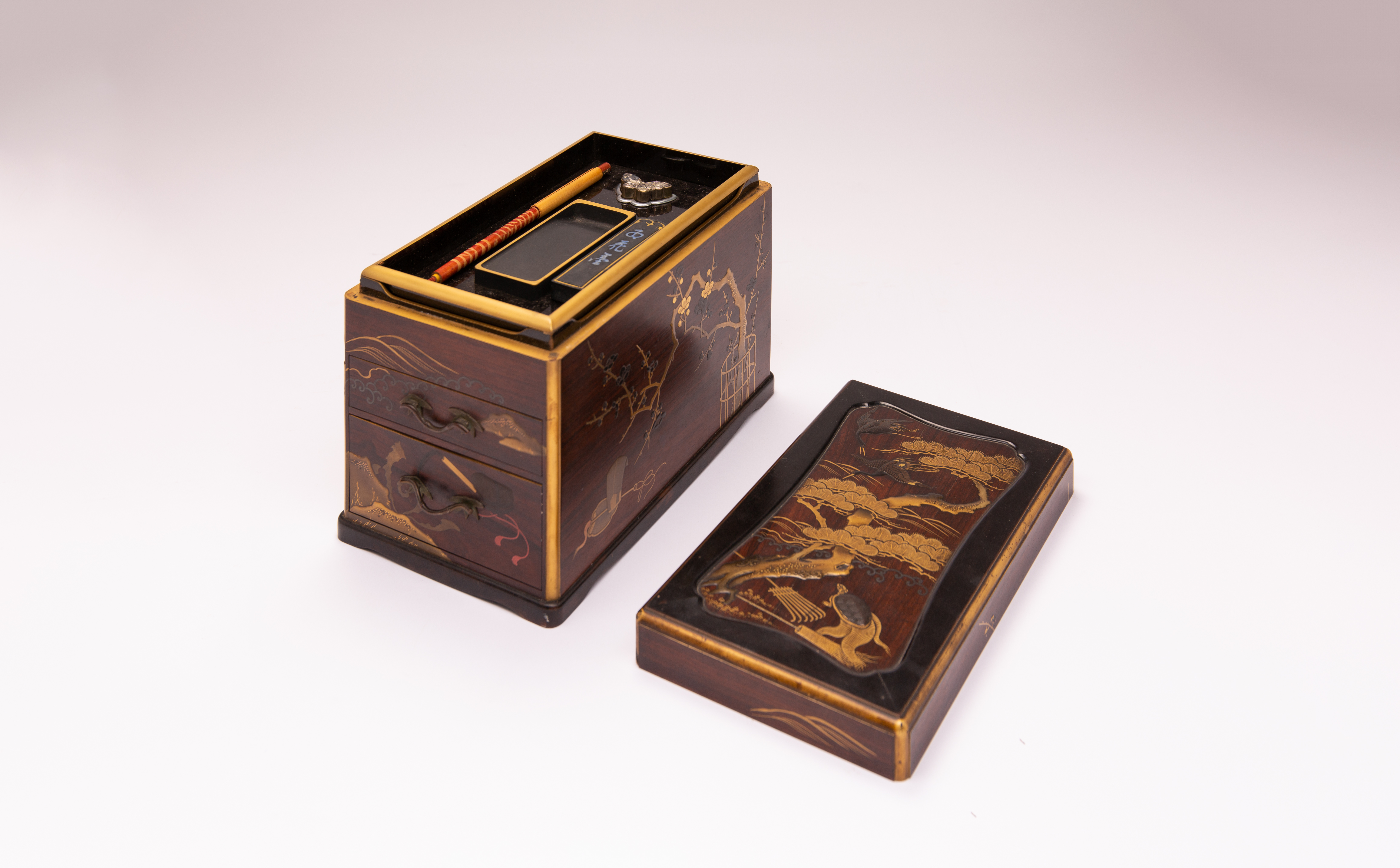 Of tall rectangular shape with two drawers to the front, the top opening to reveal an inner tray with two ink stones, a brush, and a butterfly-shaped suiteki; the box decorated in red, gold and silver hiramakie, takamakie and nashiji, the top with a minogame underneath pines and two cranes flying above, the sides with flowering branches and auspicious symbols, the interior of the lid with a large sake jar, 16cm x 14cm x 24.3cm. (7)