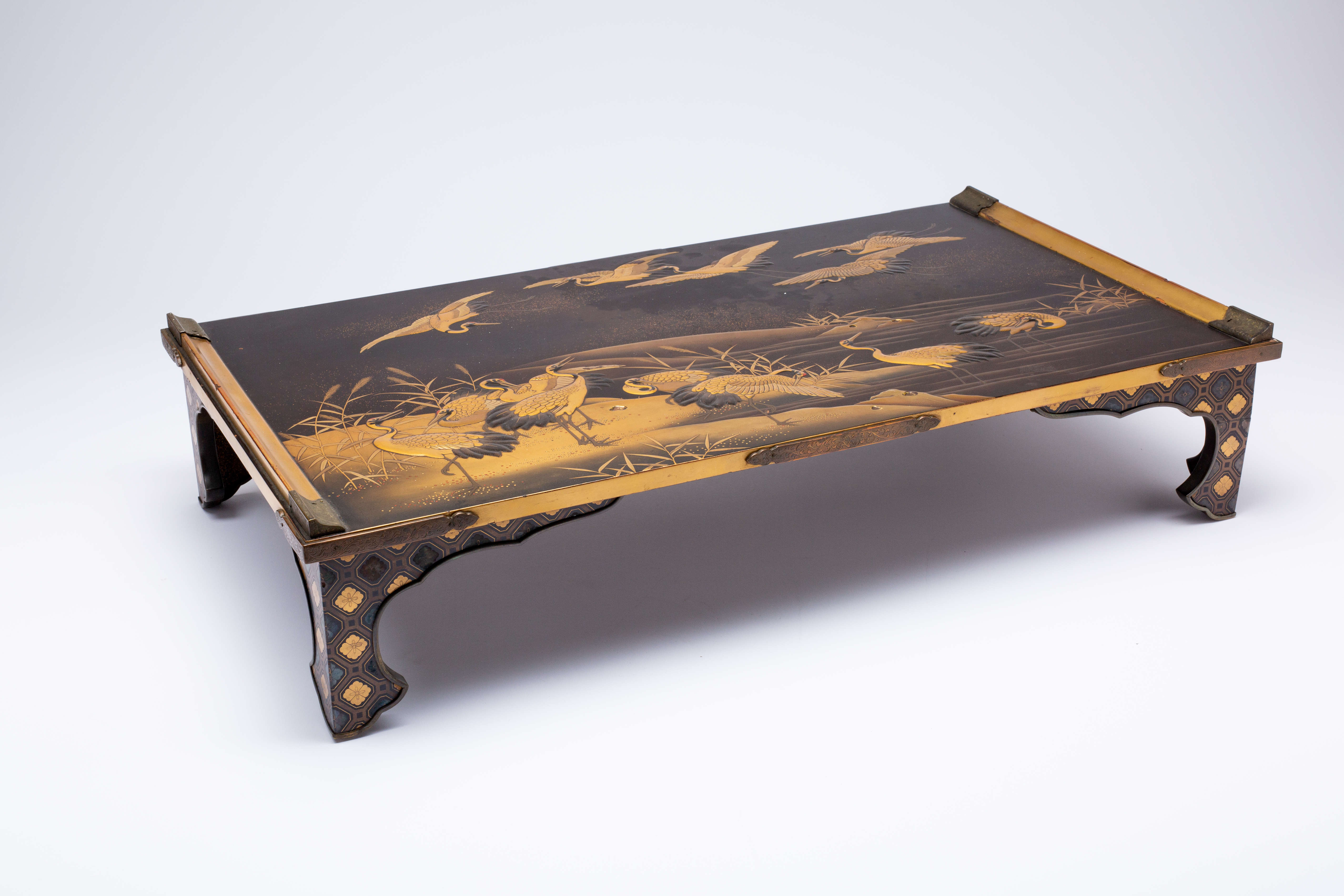 Of typical rectangular shape and raised on four scrolling feet, the top decorated with thirteen cranes, all rendered in gold takamakie, hiramakie and nashiji and with some details in red lacquer; the legs with a silver and gold diaper design enclosing four-petalled flower mon, the metal mounts decorated with scrolling tendrils, 13.8cm x 64.4cm x 36cm.