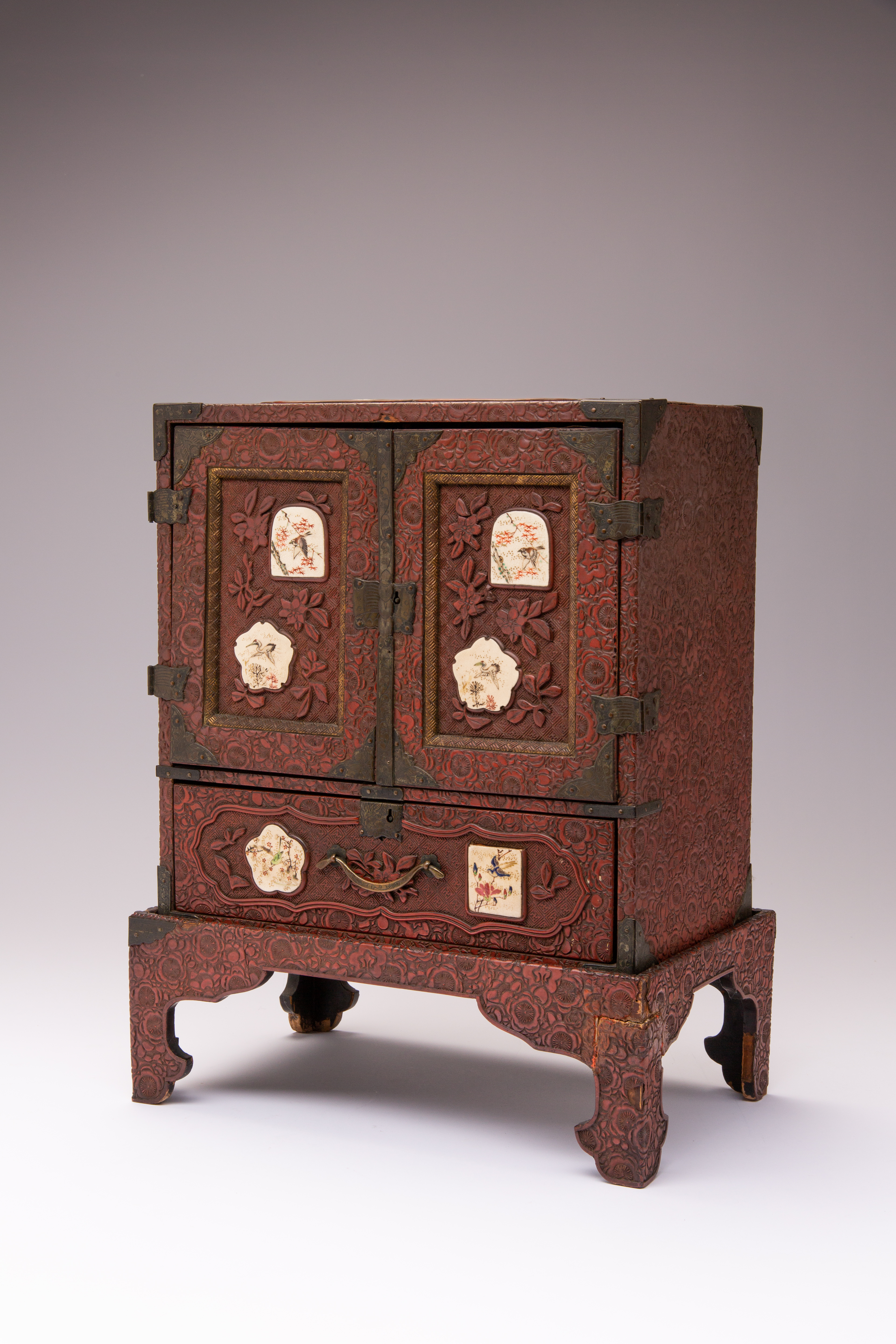 Of rectangular form and decorated in red lacquer Kamakura bori, with a pair of hinged doors to the front and a drawer below, the inside with six further drawers, raised on a four-legged stand; the surface decorated all-over with a dense pattern of prunus blossoms and inset with eight Satsuma porcelain plaques embellished with depictions of birds; the reverse of the doors carved with a kirin to one side and a dragon to the other, the metal mounts shaped as butterflies, 41cm x 32.5cm x 20.5cm overall. (2)