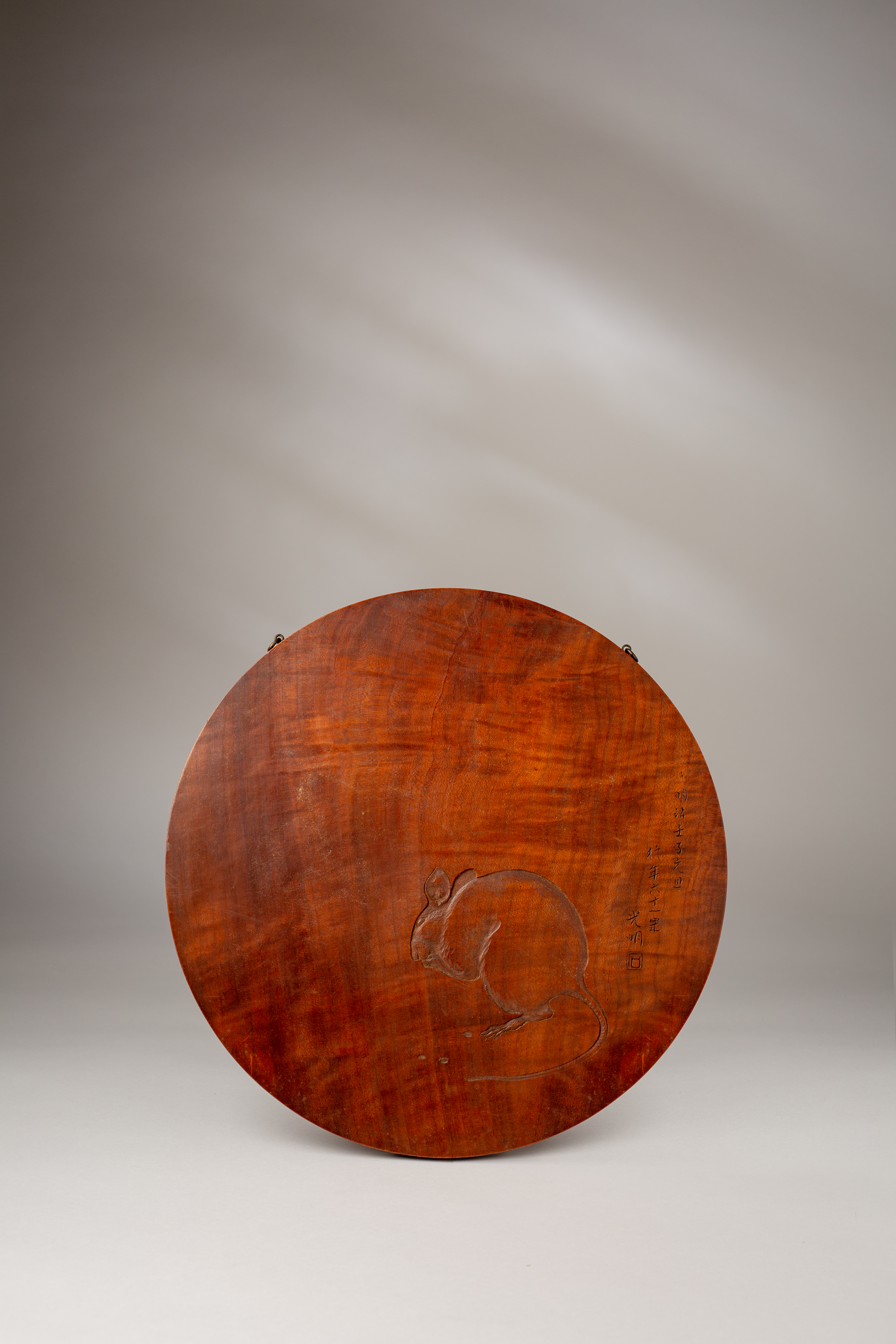 The disc decorated with a plump rat gnawing on small seeds, the charming rodent depicted in low relief, the surface of the wood grain featuring vertical striations in various shades of chocolate-brown; inscribed with three lines of calligraphy reading Meiji Mizunoe-ne Gantan, Gyonen Rokuju-ichi-sai (New Year's Day, in the year 1912 of the Meiji Period), signed Komei underneath and with a seal reading Ishi (for Ishikawa); with two metal hooks to the top for suspension; together with a fitted tomobako wood box, 31.7cm. (2)