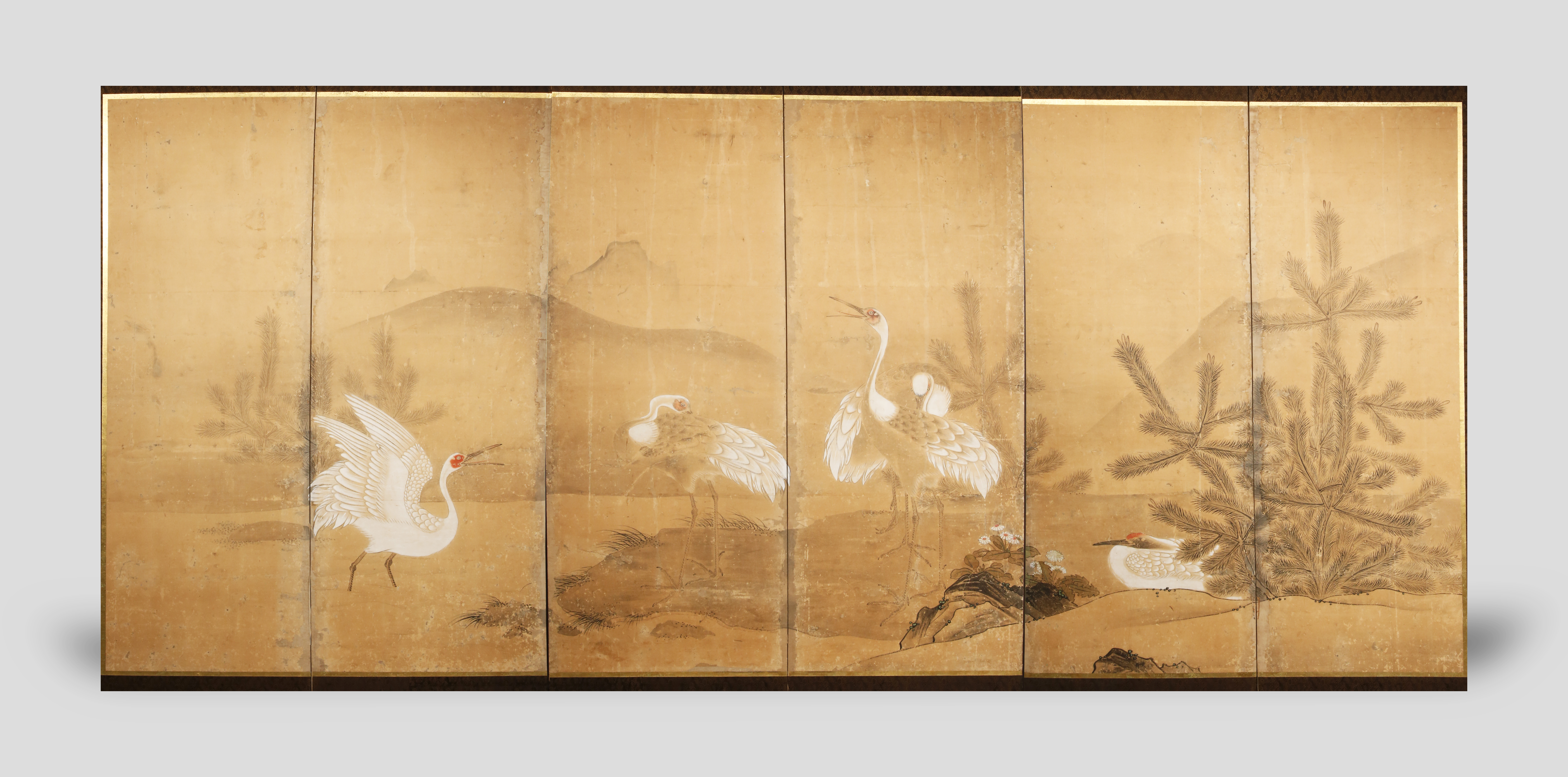 A Japanese six-panel byobu (paper screen), ink and colour on buff ground, decorated with five red-crowned Manchurian cranes, the elegant birds depicted on rocky outcrops by a stream, with branches of pine to the side and the silhouette of hills in the background, 172cm x 365cm.