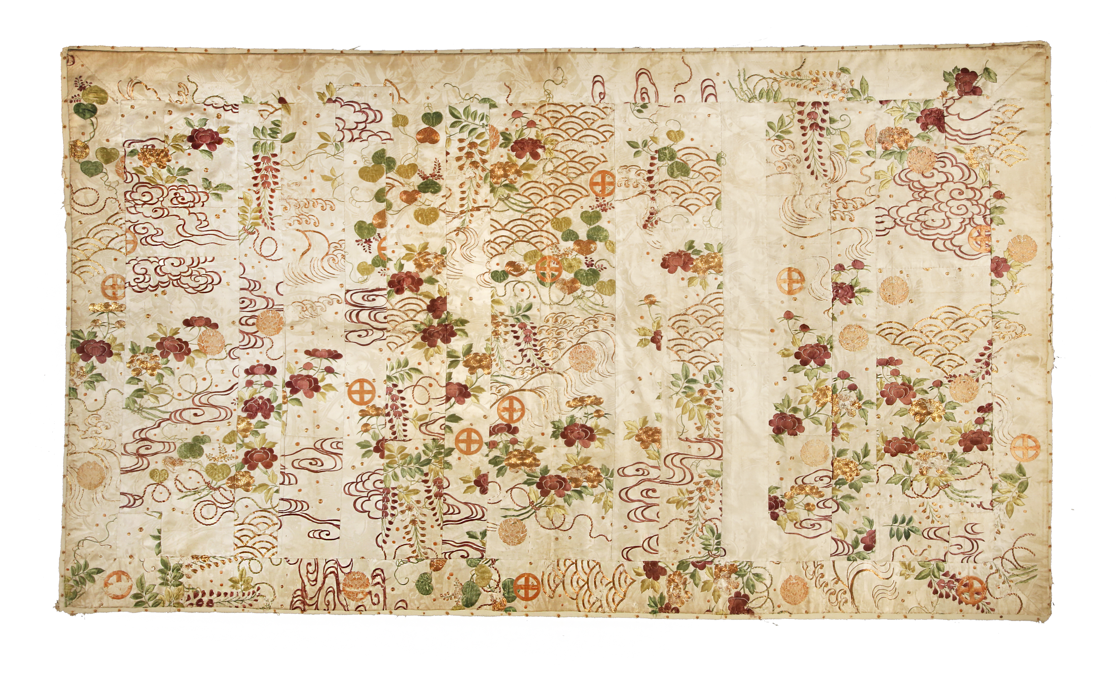 Sewn from smaller sections of silk brocade, richly decorated with the Shimazu mon of the Satsuma clan, waves, scrolling clouds, wisteria, peony and scrolling tendrils, all embroidered in gold and polychrome threads on the cream ground, 182cm x 110cm.