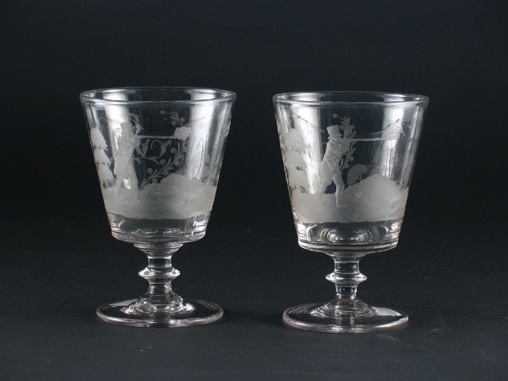 Shooting Interest: a pair of goblets, each engraved with a figure shooting game birds and initialled 'JH' 19th century, 12.8cm. (2)
